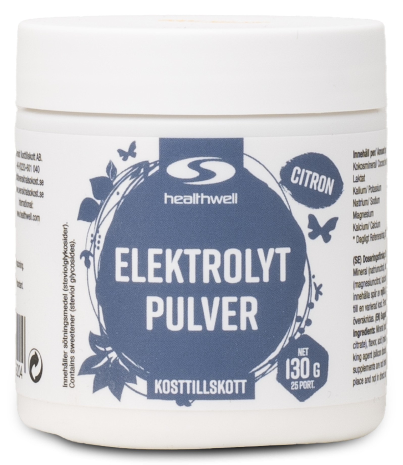 Healthwell Elektrolytpulver är ett utmärkt alternativ till vätskeersättning, för dig som tränar intensivt och långvarigt, eller under en varm sommardag. Elektrolytpulver innehåller mineraler som räknas till elektrolyter och som förbrukas snabbare genom att vi är aktiva eller svettas mycket. Att dricka mycket vatten och tillföra extra salt och elektrolyter är ett smidigt sätt att återfå vätske- och saltbalansen snabbt. Healthwell Elektrolytpulver har dessutom en god smak av citron!