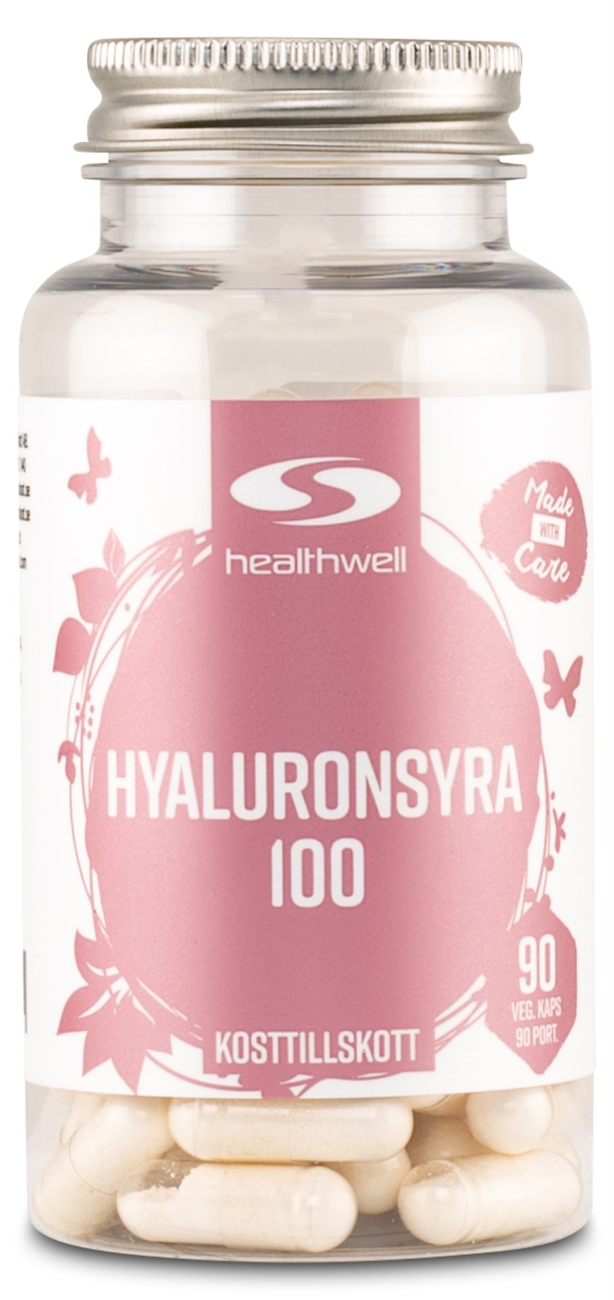 Förse hud och leder med extra näring! Healthwell Hyaluronsyra 100 är ett kosttillskott med hyaluronsyra i smidiga kapslar som är särskilt intressant för hår och leder. Dessutom är det förstärkt med antioxidanten vitamin C som skyddar cellerna mot oxidativ stress. Hyaluronsyra är ett kroppseget ämne som finns naturligt i både huden och lederna där det hjälper till att bibehålla fuktbalansen. Healthwell Hyaluronsyra 100 innehåller 100 mg hyaluronsyra per kapsel, vilket passar dig som vill ha en lägre dos eller som vill kunna kombinera med andra kosttillskott. Tillskottet är helt vegetabiliskt och därmed lämpligt för både vegetarianer och veganer.