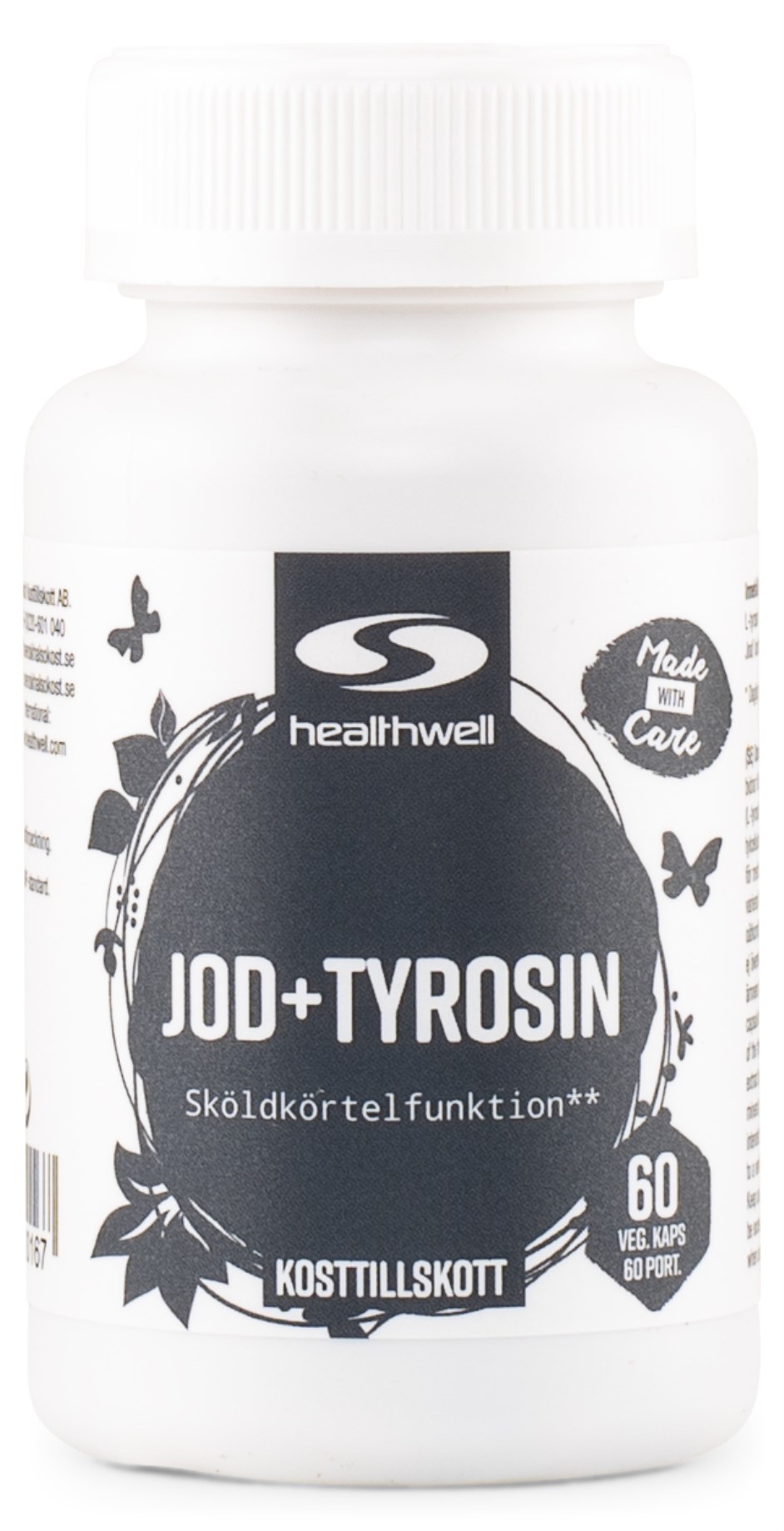 Healthwell Jod+Tyrosin är ett tillskott med mineralet jod och aminosyran tyrosin i vegetabiliska kapslar. Både jod och tyrosin är viktiga för sköldkörtelns normala funktion och bildar tillsammans sköldkörtelhormonet tyroxin. Du doserar enkelt 1 kapsel dagligen med måltid. Tillskottet helt veganskt med vegetabiliska kapslar.