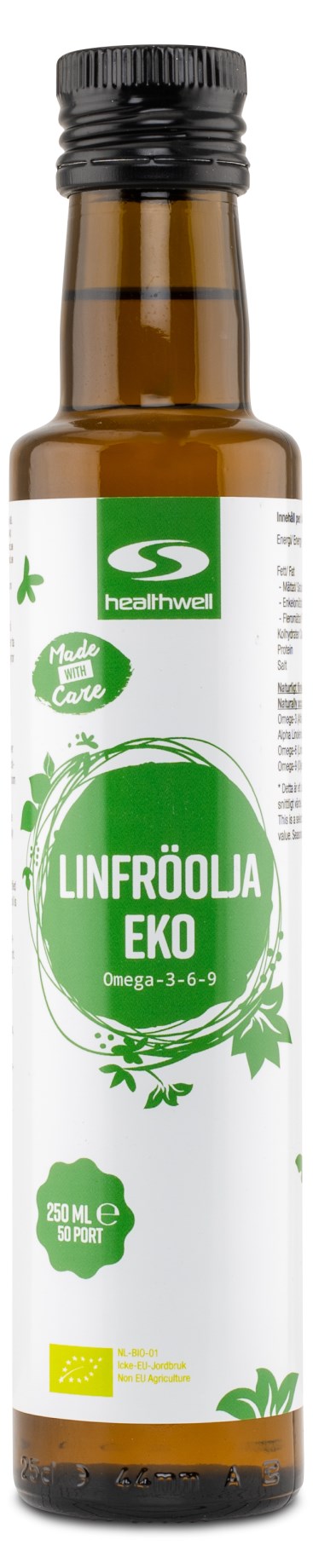 Linfröolja är inte bara en inre hälsokur utan betraktas också som välgörande för exempelvis känslig hud, tack vare dess innehåll av E-vitamin. Vitamin E har antioxidativa egenskaper som skyddar hudcellerna från skador orsakade av fria radikaler. Healthwell Linfröolja EKO förpackas omsorgsfullt i en mörk glasbehållare för att minimalt ljus ska tränga in, vilket säkerställer produkten behåller sin effektivitet och hållbarhet.