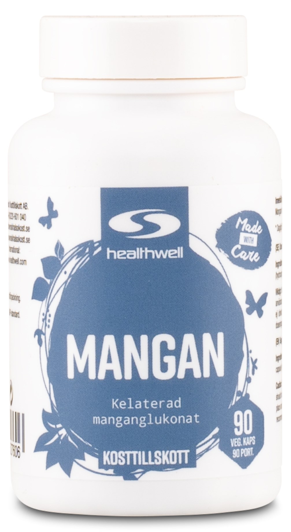 Healthwell Mangan innehåller kelaterad manganglukonat, en fördelaktig form som lätt tas upp av kroppen. Mangan är ett livsviktigt spårämne som bland annat bidrar till att bibehålla normal benstomme, till normal bildning av bindväv samt till att skydda cellerna mot oxidativ stress. Healthwell Mangan innehåller 5 mg mangan per kapsel och rekommenderad dosering är 1-2 kapslar dagligen.