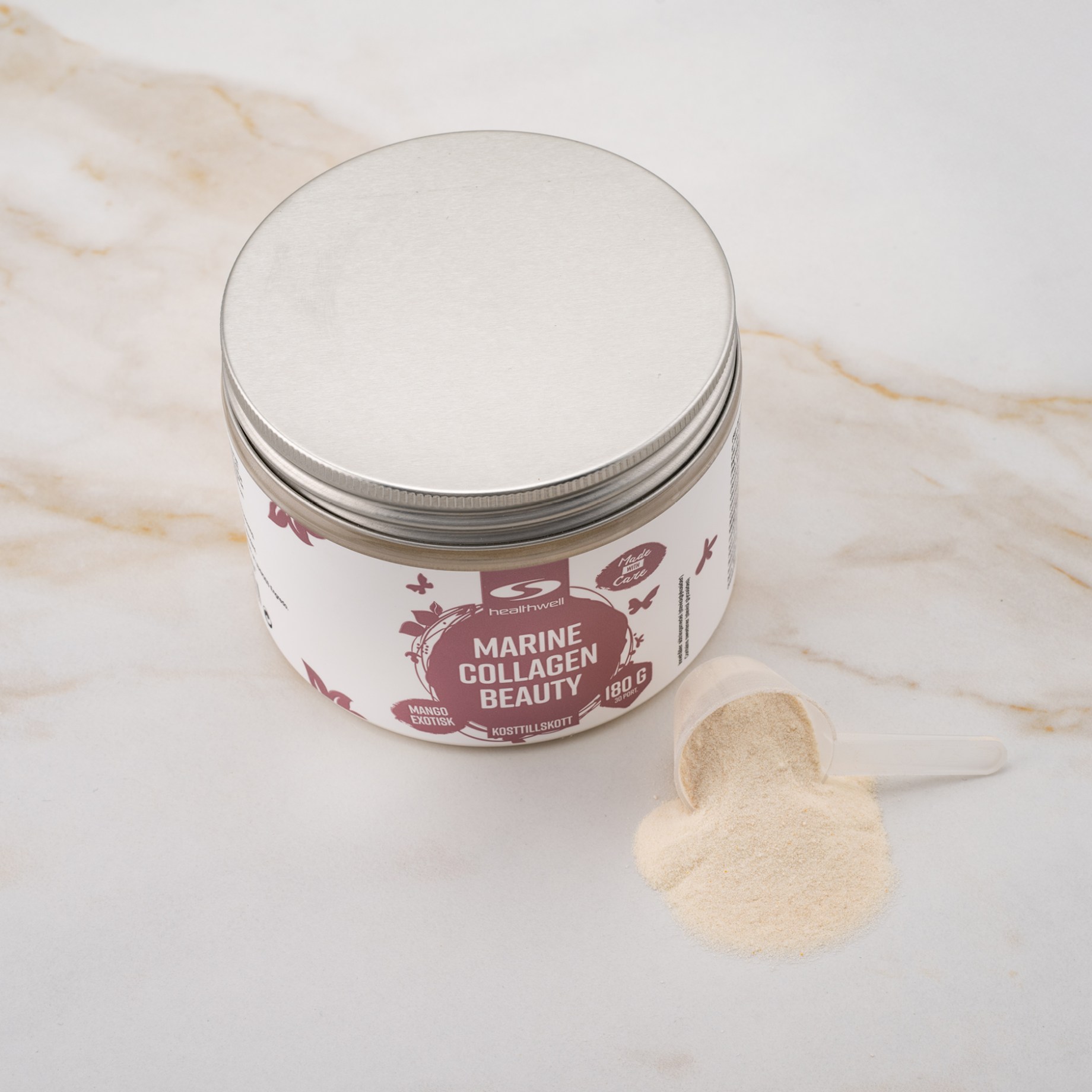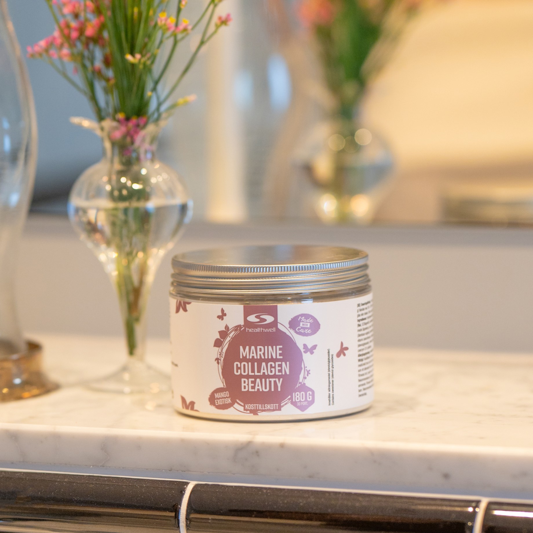 Healthwell Marine Collagen Beauty innehåller marint kollagen för att ge hår, hud och naglar en riktig boost. Marint kollagen har i studier visat sig vara en fördelaktig form av kollagen för huden (1,2). Den marina formen av kollagen innehåller nämligen en högre andel kollagen typ 1 än bovint kollagen, vilket är den typ av kollagen som ofta rekommenderas för att stödja uppbyggnaden av hår, hud och naglar. Dessutom är det marina kollagenet i Marine Collagen Beauty hydrolyserat för att enkelt kunna tas upp av kroppen.