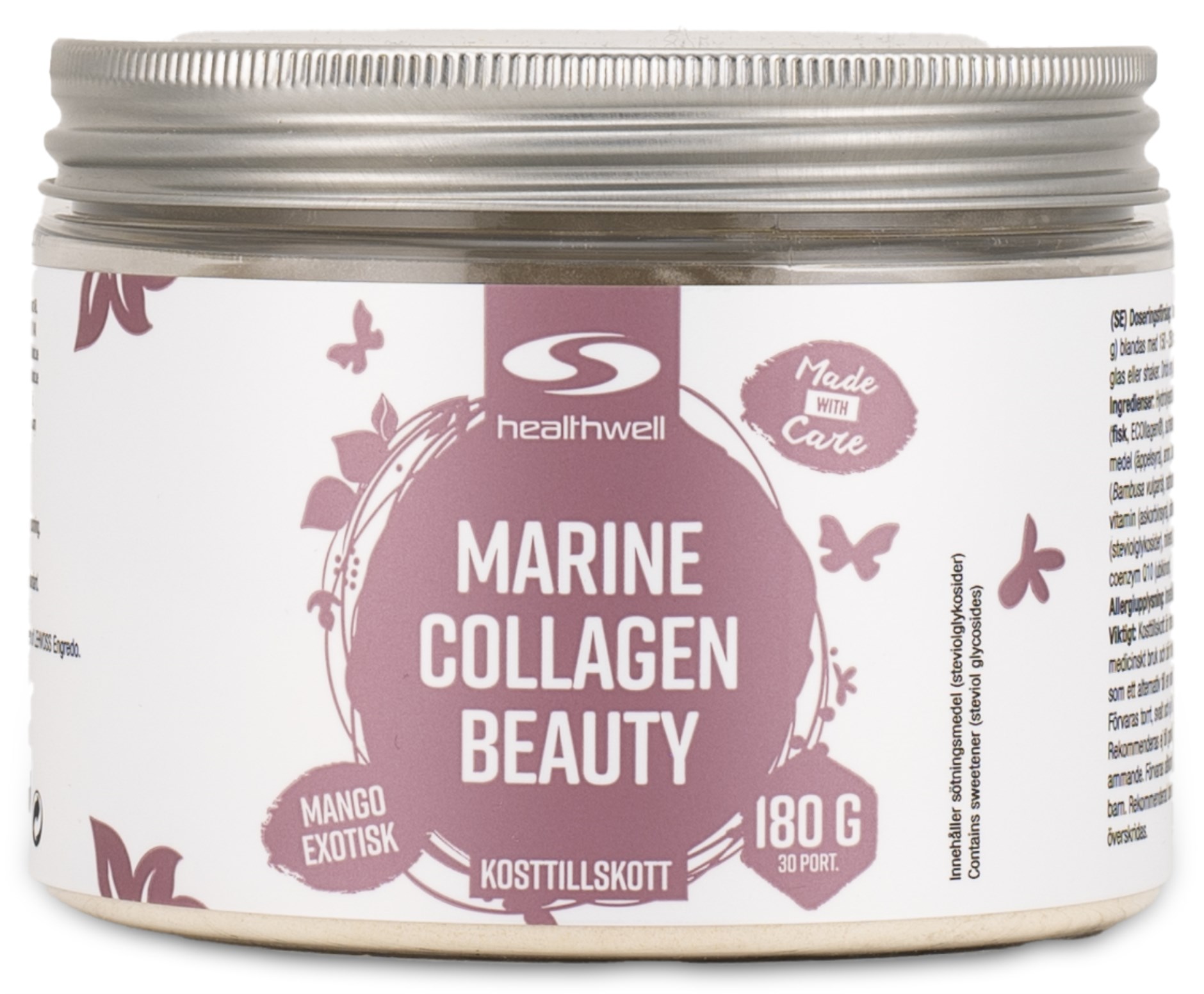 Healthwell Marine Collagen Beauty är ett välsmakande tillskott med kollagen från marina källor, samt flera fördelaktiga ämnen som boostar hår, hud och naglar inifrån. Hyaluronsyra binder fukt samtidigt som antioxidanten C-vitamin skyddar huden från fria radikaler. Tillskottet är enkelt att blanda i vätska och löses upp snabbt – använd en sked eller en shaker. Den goda smaken av exotisk mango döljer all indikation på fisksmak och för tankarna till en tropisk strand. Tillskottet är sötat med steviolglykosider för en hälsosam upplevelse.