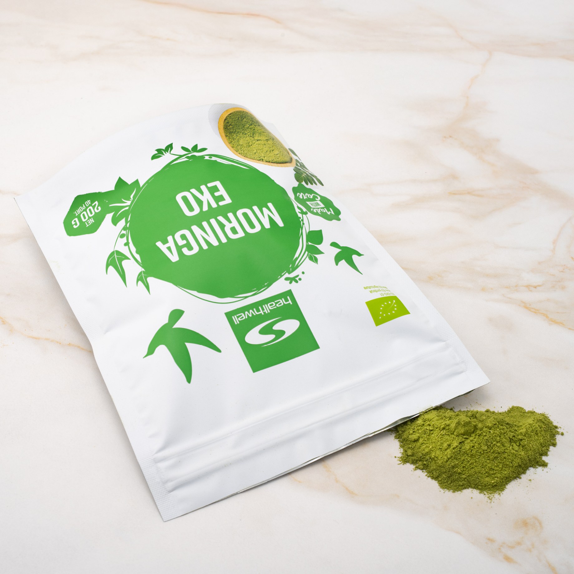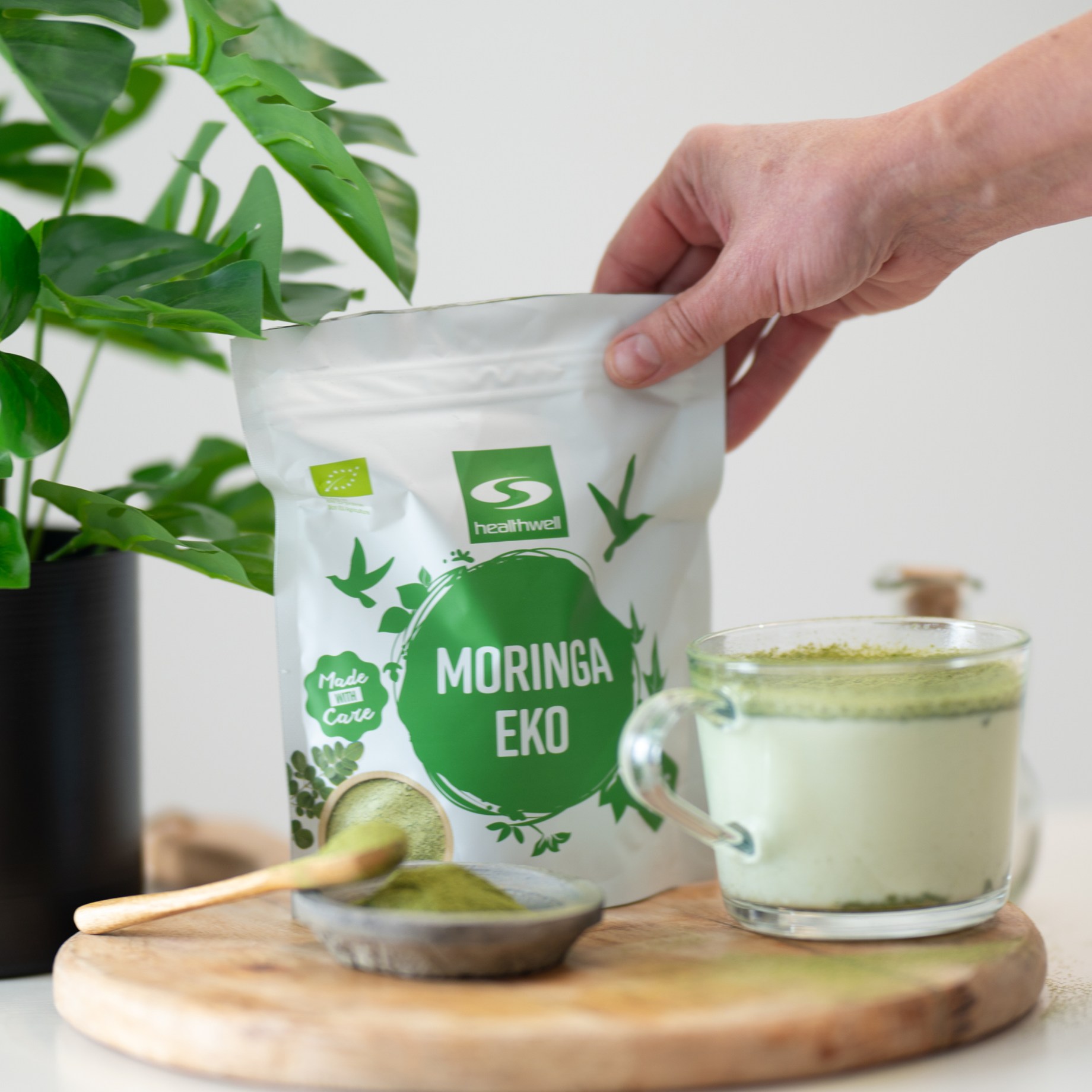Ge kroppen en näringsrik boost med Healthwell Moringa EKO, ett pulver från moringaväxten (Moringa oleifera), ofta kallad “mirakelträd” på grund av sitt näringsrika innehåll. Moringa är rik på aminosyror, antioxidanter och flera viktiga mineraler och vitaminer. Det finmalda pulvret är enkelt att blanda i ett glas vatten, en kopp te eller i en hälsosmoothie. Med sin ljusa till mellanmörka gröna färg och unika, lätt kryddiga smak som påminner om pepparrot, är det ett näringsrikt tillskott till din dagliga kost.
