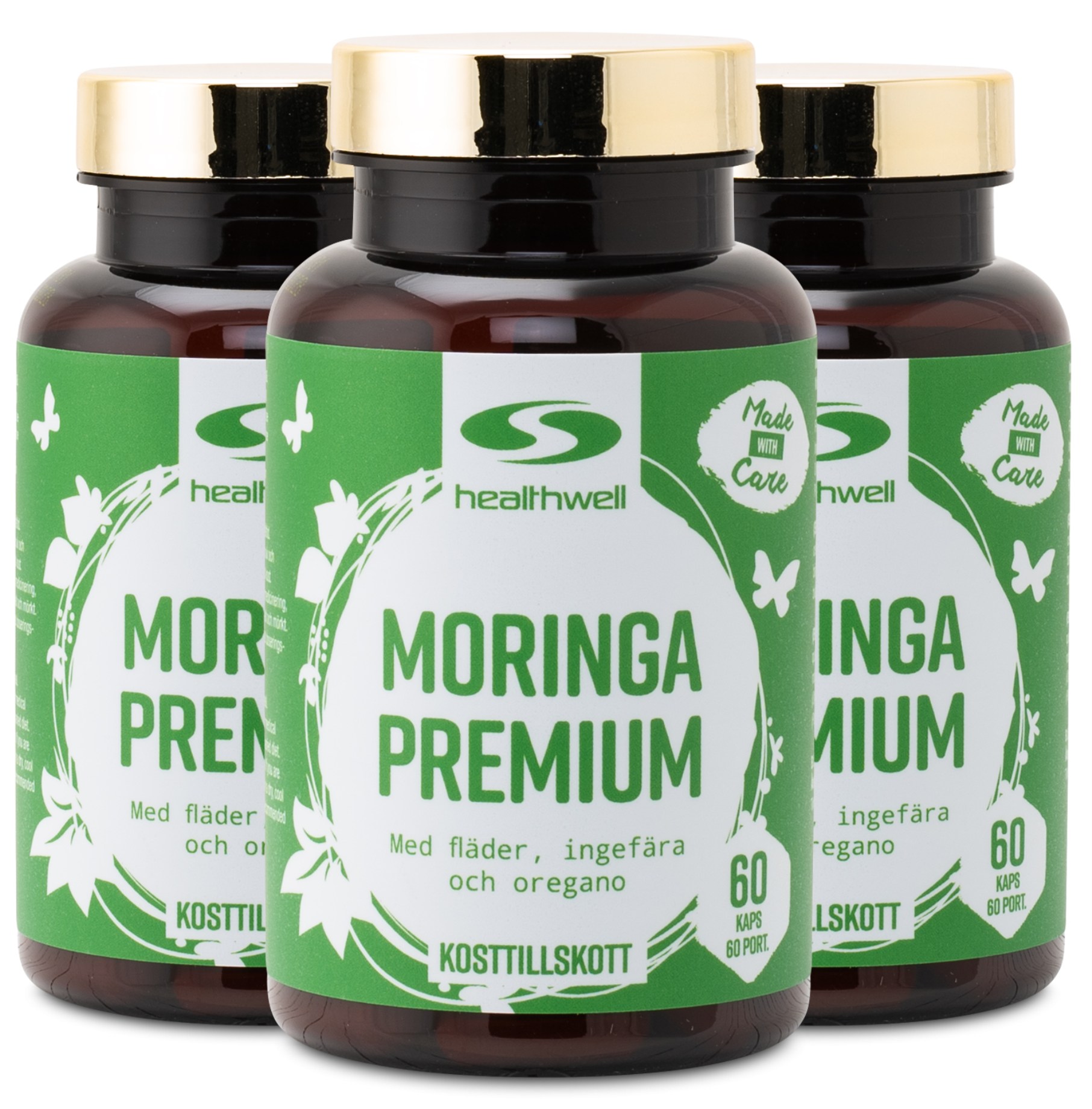 Healthwell Moringa Premium är ett extra högdoserat tillskott med moringa av högsta kvalitet. En kapsel motsvarar hela 5 gram moringapulver, vilket ger dig en riktigt bra portion moringa i varje dosering. Moringaextraktet är standardiserat till 5 % quercetin – ett intressant ämne som kan bidra till att kroppen lättare kan ta upp mineralet zink. För att du ska få en näringsboost utöver det vanliga ingår även extrakt från oregano, fläderbär och ingefära – välkända örter som används flitigt i huskurer och studeras för sina potentiella roller inom immunförsvaret. För att du ska få de allra bästa förutsättningarna att ta upp det näringstäta innehållet i Healthwell Moringa Premium, är kapslarna förstärkta med piperin från svartpepparextrakt som förbättrar biotillgängligheten av ämnena.