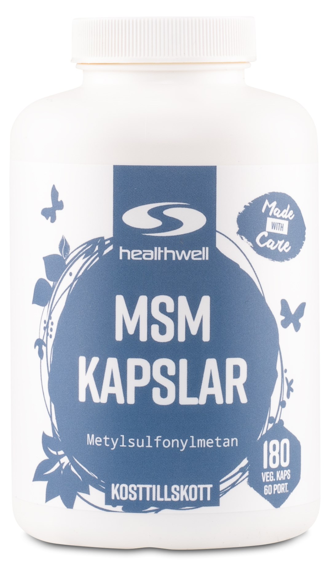 Healthwells MSM (metylsulfonylmetan) är ett högdoserat kosttillskott med rent MSM i smidig kapselform. MSM har ett högt innehåll av svavel. Det finns naturligt i kroppens kollagen, ett protein som hjälper till att ge struktur och stadga åt leder, ligament, brosk och hud. MSM bidrar även till upptaget av flera B-vitaminer samt till produktionen av vissa enzymer, signalsubstanser och aminosyror. Använd som dagligt tillskott för att bibehålla ett aktivt liv i rörelse.