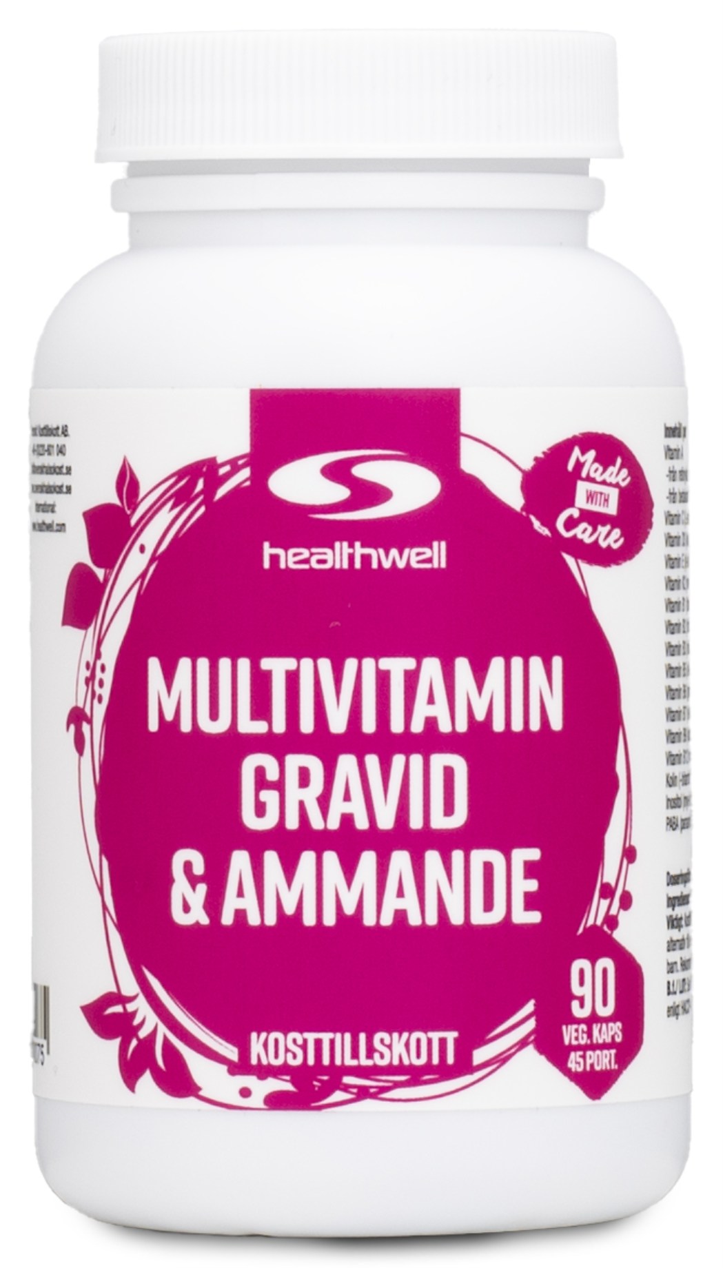 Multivitamin Gravid & Ammande från Healthwell är ett multivitamintillskott specifikt framtaget med den gravida kvinnans behov i fokus. Kosttillskottet har en komplex sammansättning av vitaminer, mineraler och grönsaksextrakt för att fylla det dagliga behovet av näringsämnen för den gravida eller ammande kvinnan. Med extra järn och folat (vitamin B9) för att stödja blodbildning och fosterutveckling, samt extra näring från bland annat broccoli, tranbär och blåbär.