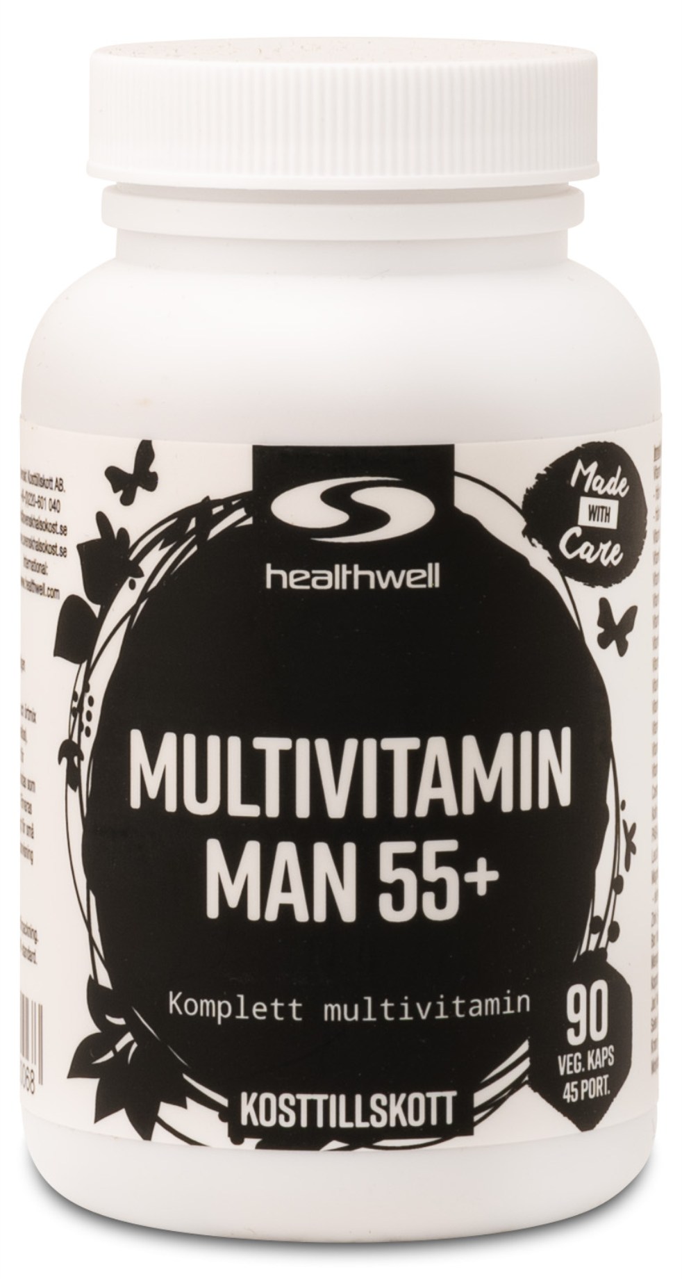 Healthwell Multivitamin Man 55+ innehåller flera ämnen och växtextrakt speciellt utvalt för män. I tillskottet finner du bland annat koenzymen Q10. Ämnet finns naturligt i våra celler, främst runt kroppens vitala organ som till exempel hjärta och hjärna. Q10 har antioxidativa effekter och är viktigt för kroppens energiomsättning. Kroppen kan själv producera Q10, men denna produktion avtar när du blir äldre. Stigande ålder kan även påverka vår syn. Därför innehåller Multivitamin Man 55+ också ämnet lutein från ringblomma. Lutein är ett provitamin som kan omvandlas till vitamin A, ett vitamin som verkar för normal syn och ögats normala funktion. Även pumpakärnextrakt och granatäpple är tillsatt, som båda innehåller näringsämnen som främjar en hälsosam prostata. Även naturliga extrakt från nypon, tomat och broccoli är tillsatt för att boosta näringsinnehållet ytterligare.