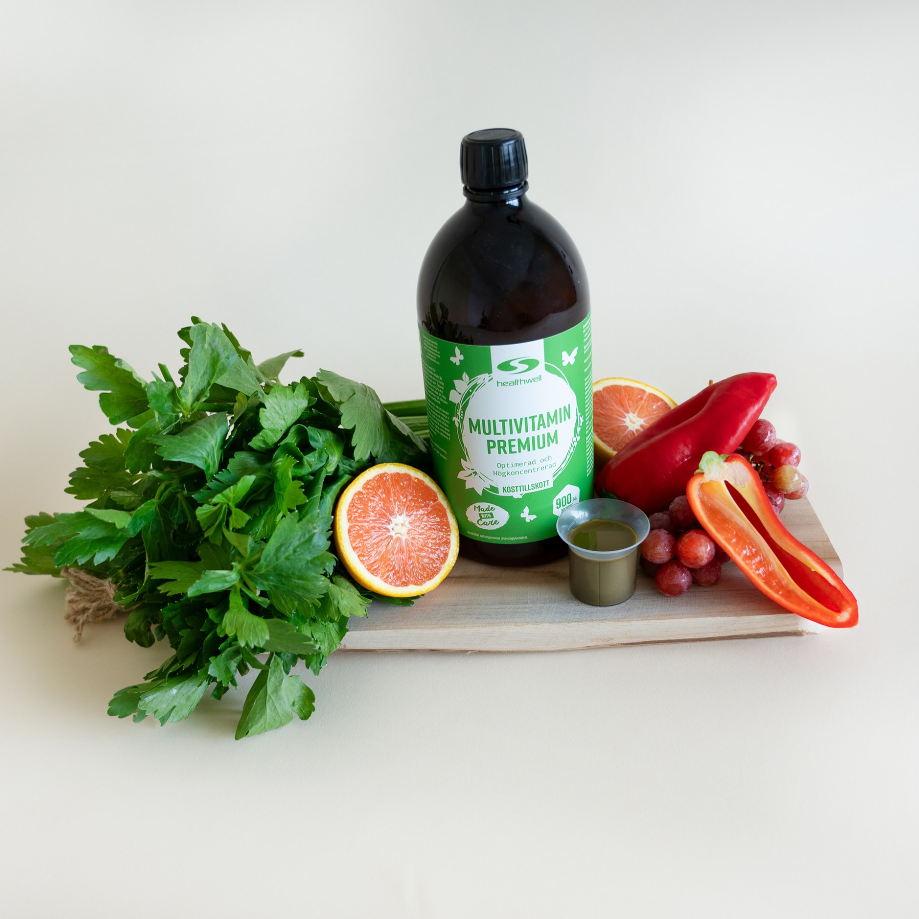Healthwell Multivitamin Premium är ett komplett och högdoserat multitillskott i flytande form. Tillskottet är formulerat efter våra 10 mest potenta produkter och innehåller en optimal dos av de viktigaste vitaminerna och mineralerna i de mest gynnsamma formerna. Med Multivitamin Premium slipper du hålla koll på olika kapslar och tabletter - detta tillskott komprimerar alla dina dagliga vitamin- och mineraltillskott till ett enda så att du enkelt kan säkerställa ditt dagliga intag. Tack vare innehållet av MCT-olja tas det dessutom lätt upp av kroppen.