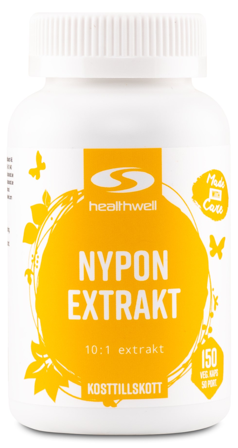 Nyponpulver har länge använts till djur för att öka dess rörlighet. På senare år har även människan börjat använda nypon som en hälsoråvara. Med Healthwell Nypon Extrakt får du i dig alla de goda egenskaperna från nyponen i en enda liten kapsel, tack vare dess högkoncentrerade innehåll. Till exempel innehåller nypon antioxidanten C-vitamin som motverkar oxidativ stress i kroppen. Dessutom innehåller det också flavonoider som har antioxidativa egenskaper. Vitamin C bidrar även till kollagenets normala produktion, ett protein som har stor betydelse för upprätthållandet av en normal benstomme och brosk i leder.