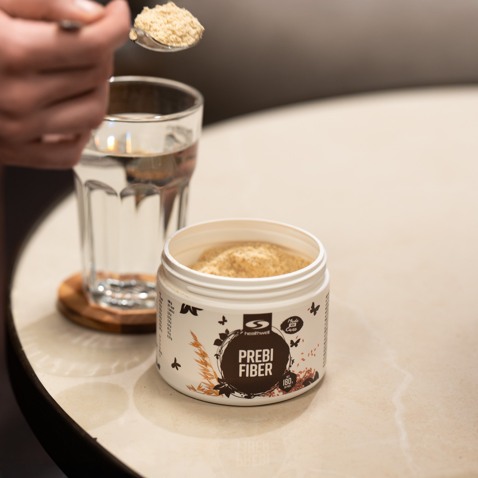 PrebiFiber från Healthwell är ett tillskott med fibrer i pulverform, med flera olika fibertyper som samtliga fungerar som prebiotiska fibrer till tarmbakterierna. Fibrerna i PrebiFiber är gelébildande och mättar bra, vilket är utmärkt för den som vill höja sitt fiberintag och för den som vill hålla blodsockret på en jämn nivå. De prebiotiska fibrerna i PrebiFiber består av en grund av psylliumfröskal tillsammans med bland annat havrefibrer och glukomannan.
