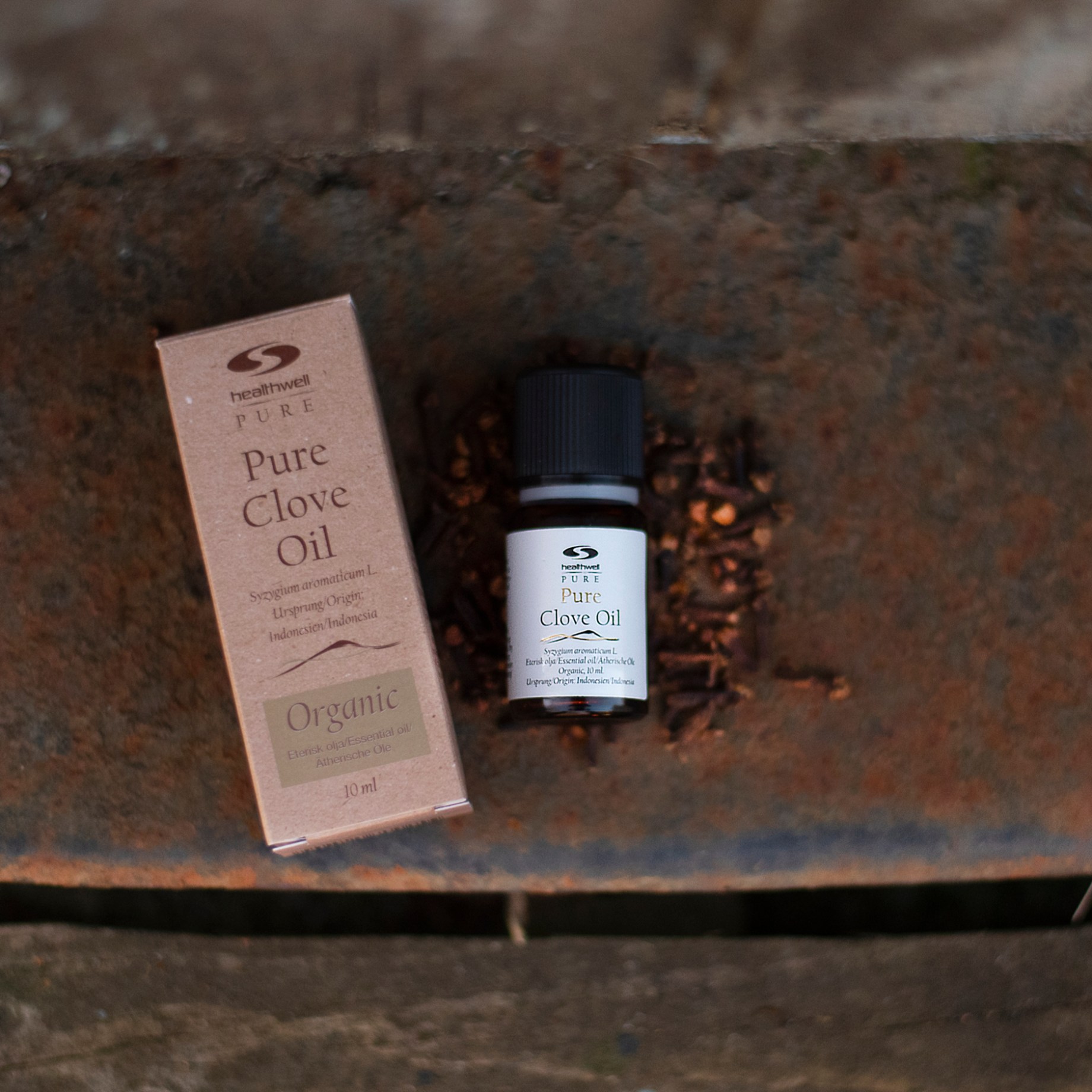 Healthwell PURE Kryddnejlikaolja EKO på yta tillsammans med torkade kryddnejlikor.Kryddnejlikaolja har en varm, kryddig och fyllig doft.