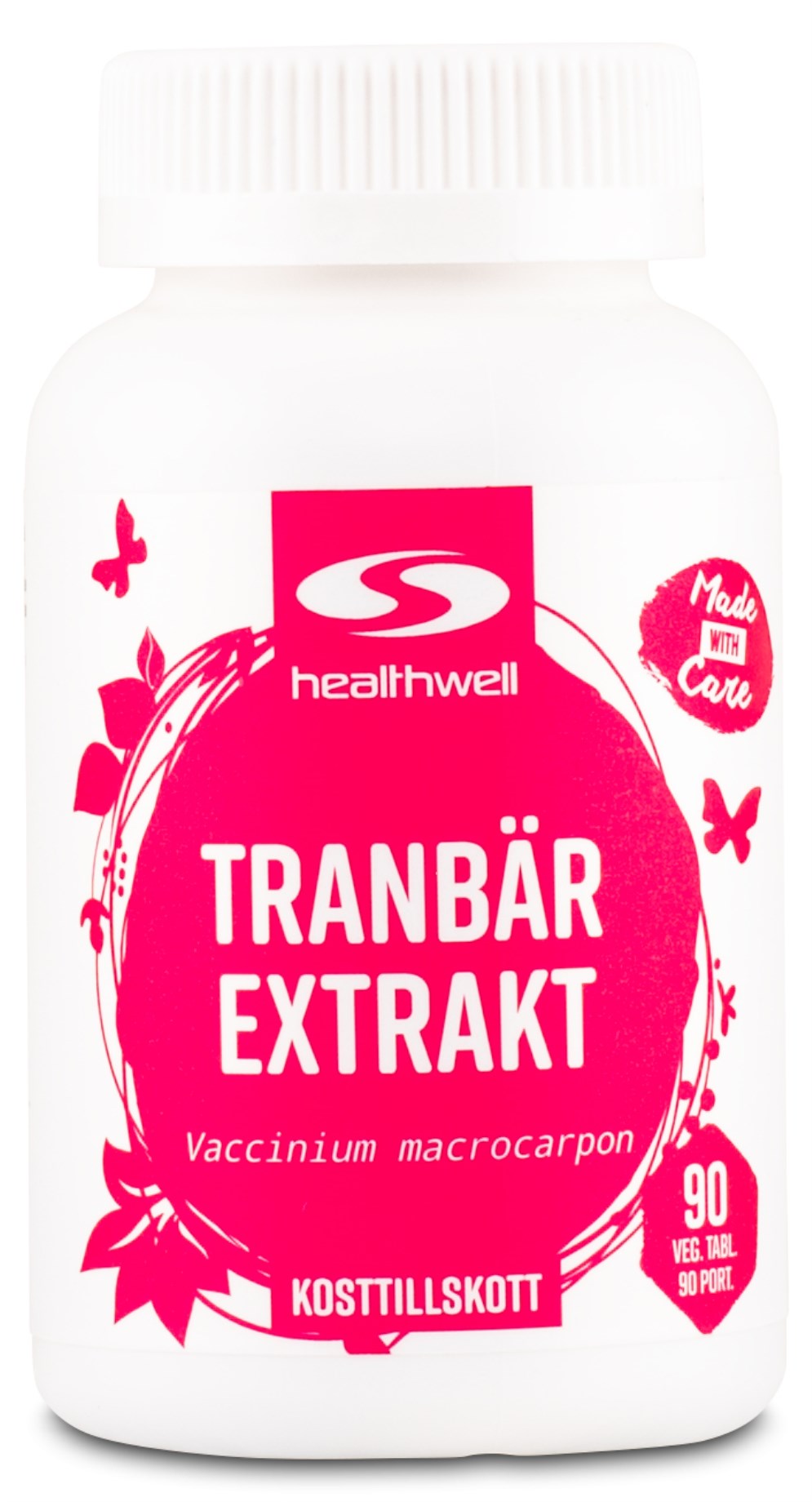 Healthwells Tranbärsextrakt består av vegetabiliska tabletter med extrakt av tranbär. Extraktet är mer koncentrerat än ett rent tranbärspulver och 1 kilo extrakt motsvarar i det här fallet hela 36 kg tranbär. Tabletterna sätts samman av de vegetabiliska ingredienserna kokosolja och cellulosa, och pressas sedan ihop med hjälp av kallpressning för att så mycket som möjligt av tranbärens naturliga näringsinnehåll ska bibehållas.