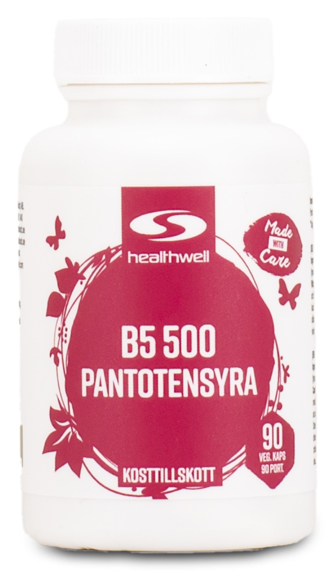 Healthwell Vitamin B5 500 Pantotensyra innehåller 500 mg aktiv mängd pantotensyra per kapsel, i formen kalcium-D-pantotenat. Kosttillskottet rekommenderas till 1 kapsel om dagen och kan ätas varje dag och kombineras med andra kosttillskott. Ett utmärkt val för dig som vill säkerställa intaget av detta vitamin.