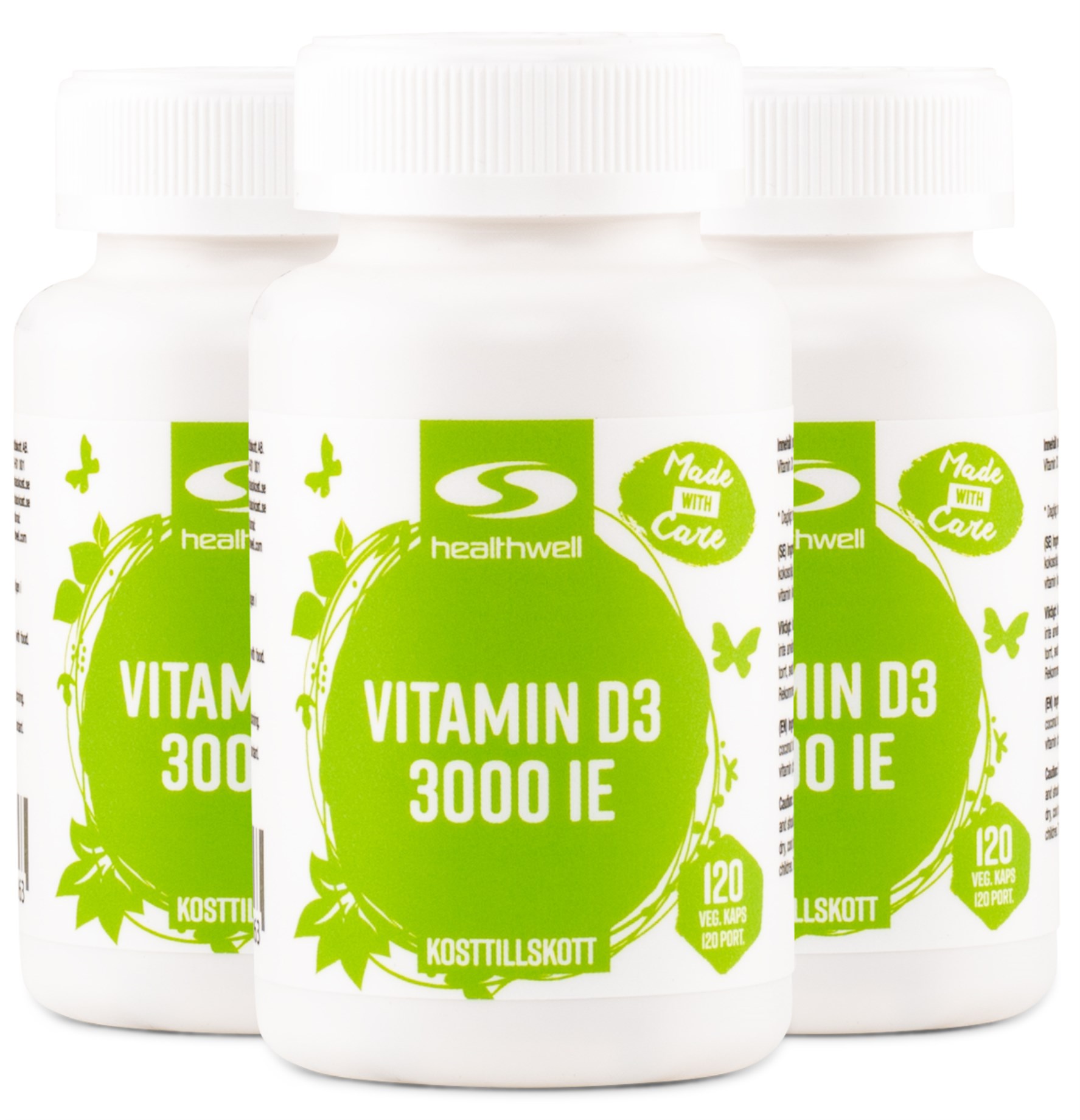 Vitamin D3 från Healthwell är ett högdoserat tillskott med 3000 IE per dos. Vitaminet är utvunnet från fårull och består av kolekalciferol som är den naturliga formen hos djur, en aktiv form av D vitamin. D Vitaminbidrar till upptaget av kalcium och reglering av kalciumnivåer i blodet, vilket i sin tur är väsentligt för ett normalt fungerande skelett.
