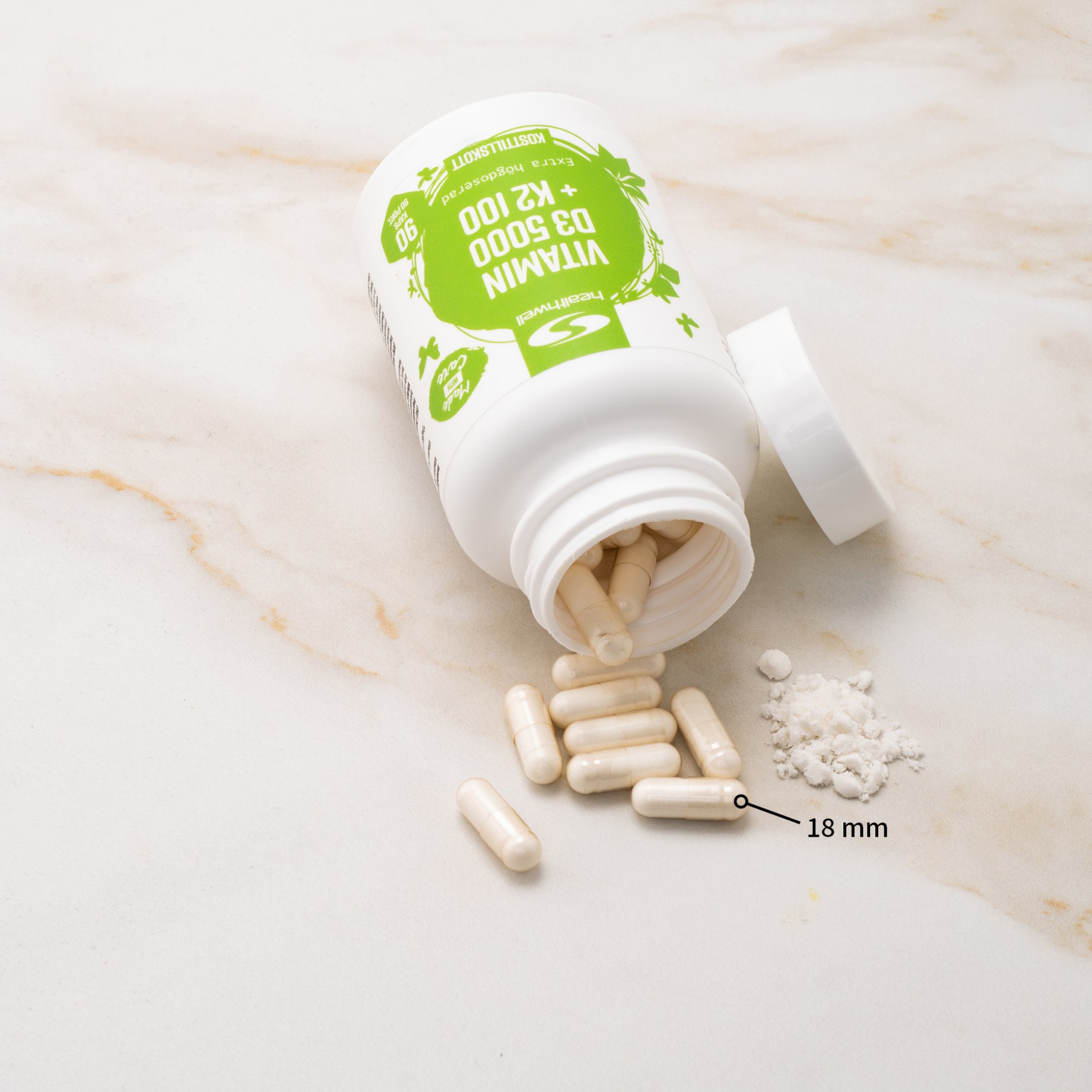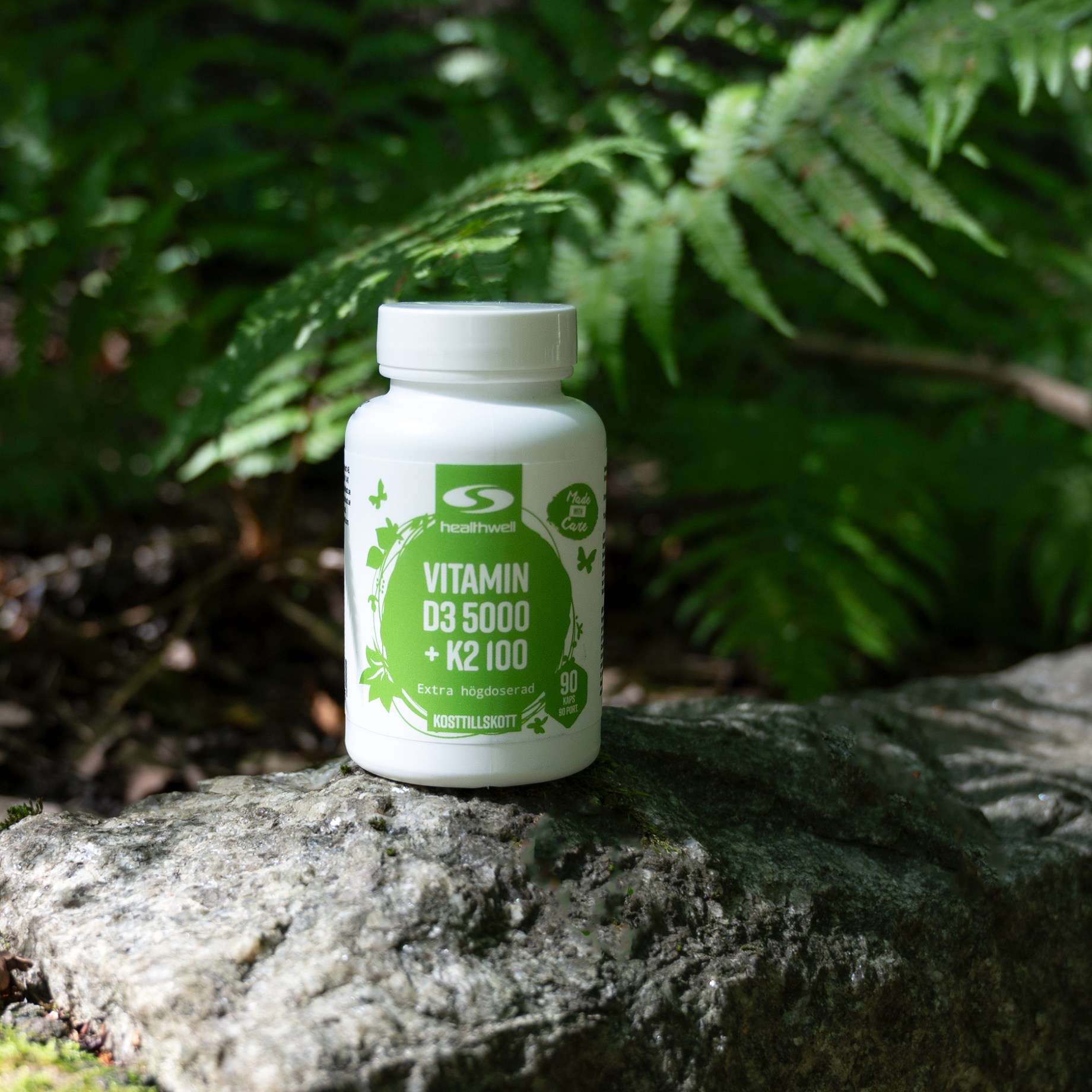 Healthwell Vitamin D3 5000 + K2 100 är vårt högst doserade D-vitamin i fördelaktig kombination med vitamin K! Under vinterhalvåret är det svårare för många att få i sig tillräckligt med D-vitamin och därför kan ett tillskott hjälpa till att säkra upp intaget. D-vitamin är viktigt i kroppen och bidrar både till immunsystemets normala funktion samt till normal benstomme. Medan D-vitamin hjälper kroppen att ta upp kalcium reglerar K-vitamin vad kalciumet används till. Vid höga doser av D-vitamin är det fördelaktigt att äta K-vitamin för att bättre omsätta kalcium.