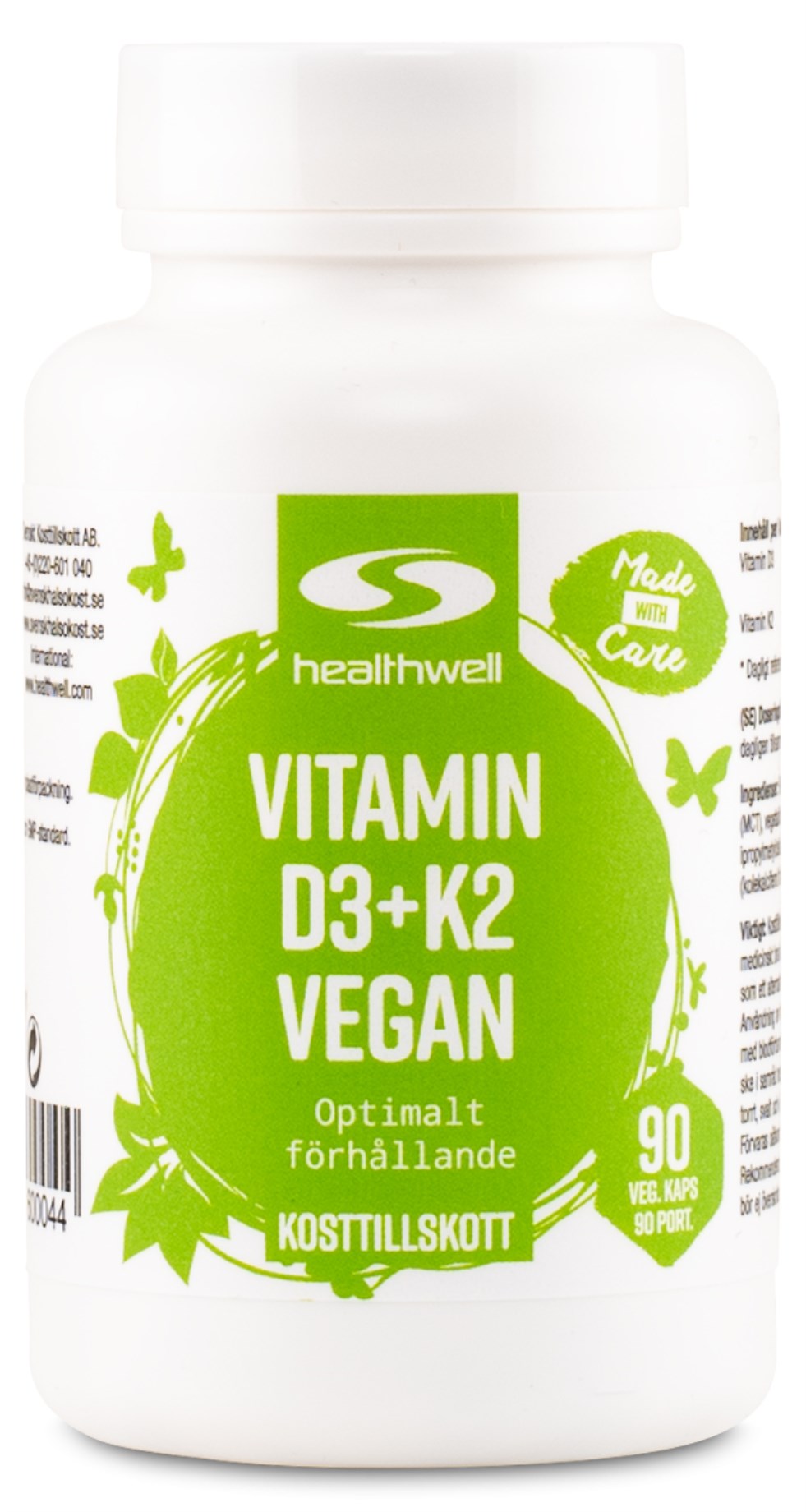 Healthwell Vitamin D3-+K2 Vegan är ett välbalanserat, veganskt tillskott med vitamin D och vitamin K. Att kombinera dessa vitaminer är fördelaktigt då de samverkar och hjälper kroppen att bibehålla en normal benstomme. Vitamin D bidrar dessutom till musklernas samt immunsystemets normala funktion, medan vitamin K är viktigt för blodkoagulationen.