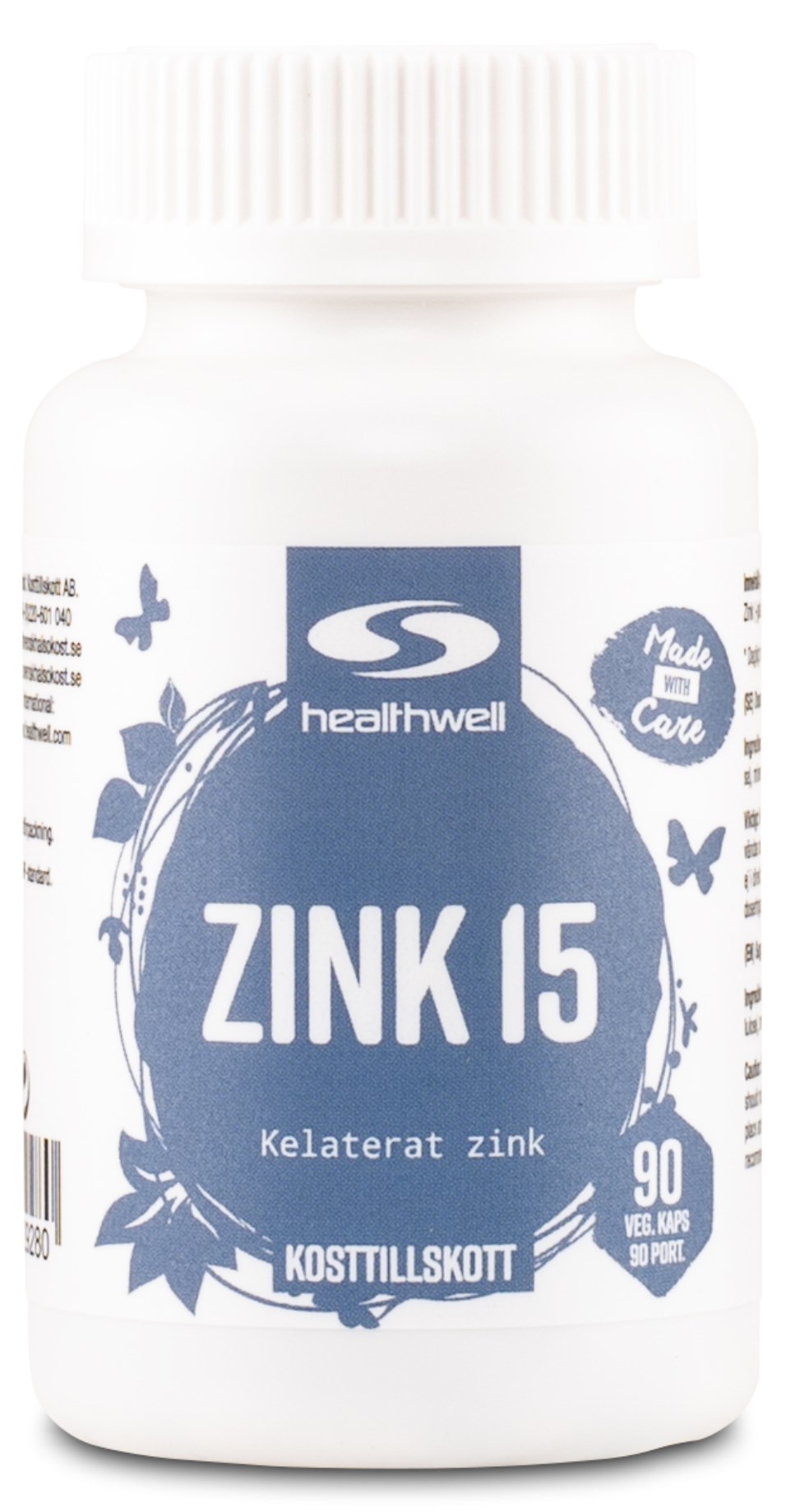 Healthwell Zink 15 är ett kosttillskott med mineralet zink i vegetabiliska kapslar. Tillskottet innehåller tre former av zink i extra lättupptagliga former. Zink är en viktig mineral som deltar i flera viktiga processer i vår kropp. Det fungerar bland annat som en antioxidant som skyddar våra celler mot oxidativ stress och bidrar även till kvaliteten på hud, hår och naglar. Zink är dessutom viktigt för att vi ska bibehålla ett normalt fungerande immunsystem. Healthwell Zink 15 innehåller 15 mg zink per kapsel, vilket passar dig som vill kunna kombinera med andra kosttillskott.
