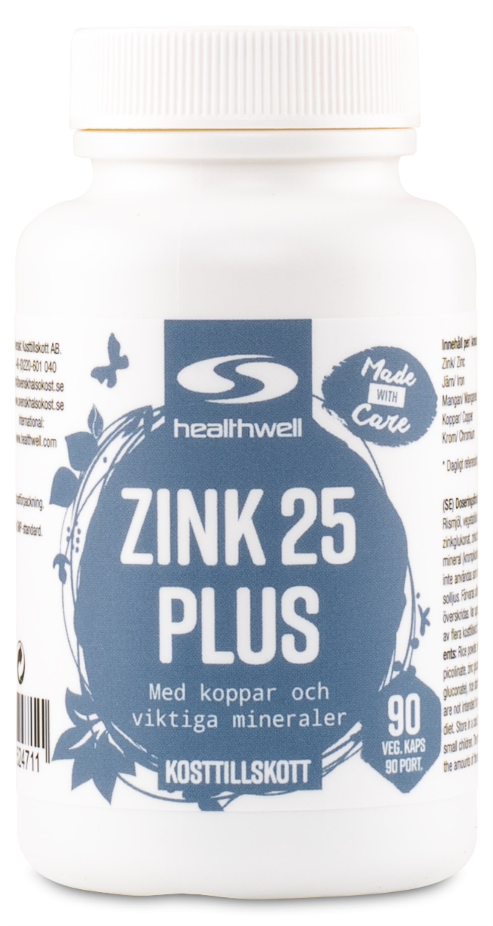Zink 25 Plus är vegetabiliska kapslar med organiskt zink från tre högvärdiga källor. Detta zinktillskott är extra högdoserat och här finns även andra viktiga mineraler tillsatta för att undvika att kroppens nivåer urlakas av dem. Zink har många funktioner i kroppen och är även en viktig antioxidant. Denna livsnödvändiga mineral påverkar bland annat omsättningen av protein, fett och kolhydrater. Zink behövs även för att immunsystemet ska fungera optimalt.