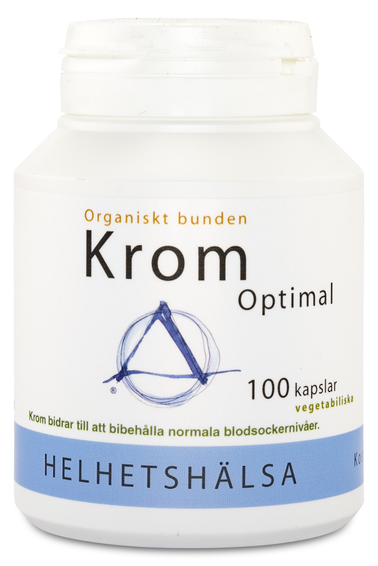 Helhetshälsa KromOptimal är ett optimalt kosttillskott med mineralet krom. Krom har många funktioner i kroppen, bland annat deltar det i glukosupptaget, vilket i sin tur bidrar till normala blodsockernivåer. Krom är även betydelsefull för upptaget av makronäringsämnen, exempelvis protein. Helhetshälsa KromOptimal är registrerad hos Vegan Society för sitt vegetabiliska innehåll.