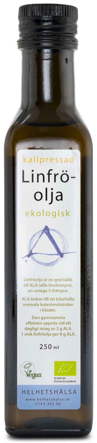Helhetshälsas Linfröolja är kallpressade ekologiska linfrön. Linfröna är varsamt hanterade vid tillverkningsprocessen och fylls upp i mörka flaskor för att skyddas från ljus och syre. Linfröoljan har en mild och god smak och tack vare det naturliga ursprunget smaken variera något från flaska till flaska.