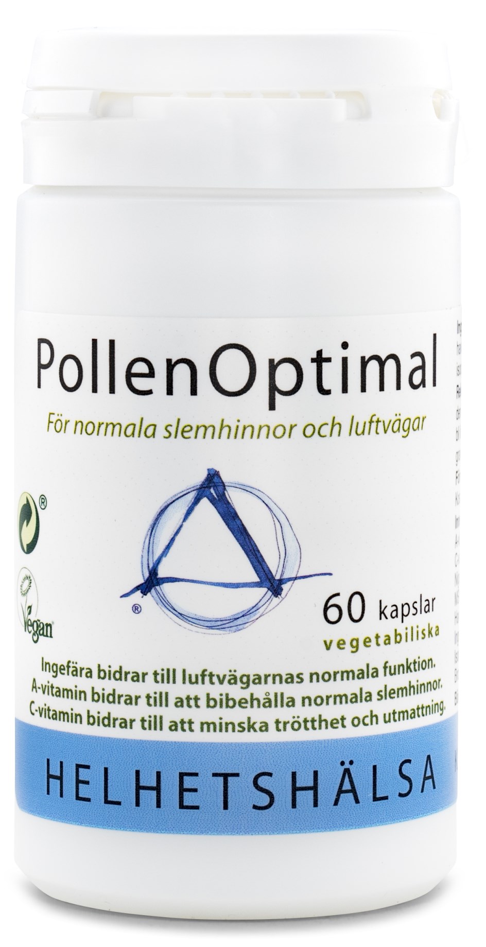Helhetshälsa PollenOptimal kapslar innehåller flera ämnen som bidrar till att hålla uppe immunförsvaret och energinivåerna. Kapslarna innehåller vitamin C som bidrar till att minska trötthet och utmattning och dessutom till ett normalt immunsystem. Vitamin A bidrar till slemhinnornas normala funktion, något som kan vara extra uppskattat i tider av pollen och allergier. Utöver dessa vitaminer innehåller Helhetshälsa PollenOptimal även bromelain, MSM, ingefära och svartkumminextrakt.