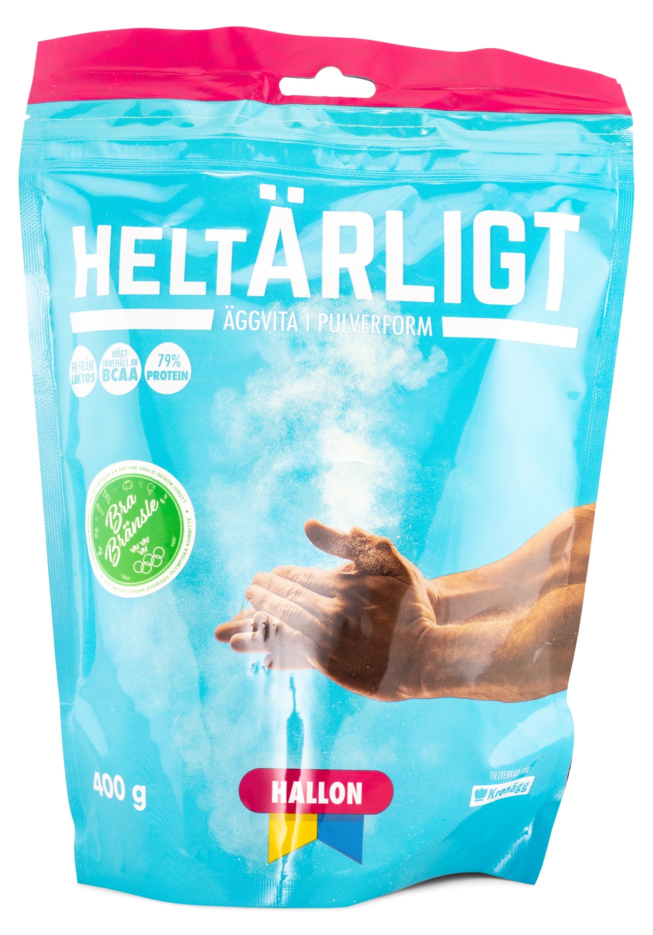 Helt Ärligt Äggvitepulver är smaksatt äggvita i pulverform framställt av Kronägg med svenska ägg i Sverige. Äggvitepulvret passar perfekt för både dig som är laktoskänslig eller vegetarian. Helt Ärligt Äggvitepulver är naturligt rikt på högkvalitativt protein och aminosyror. Gör det både gott och enkelt för dig att få i dig ditt dagliga behov av protein genom att ta en shaker med Helt Ärligt äggvita i pulverform eller förstärka ditt mellanmål eller bakning med det.