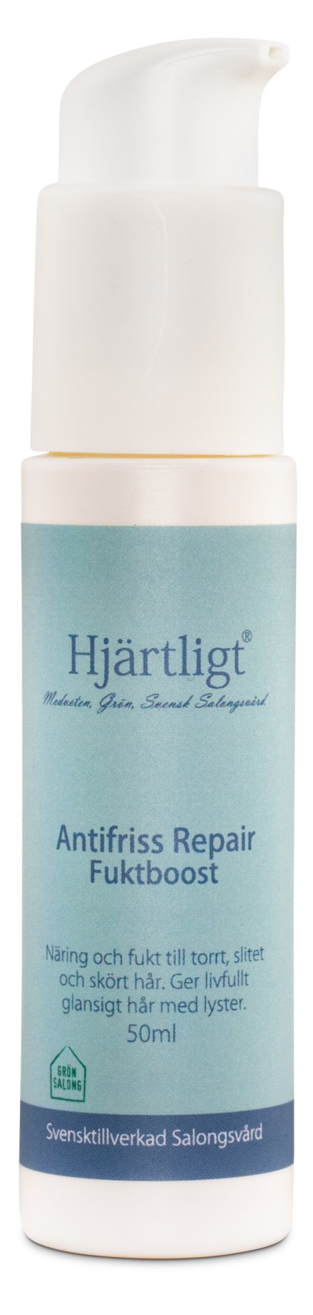 Ta hand om ditt hår och reparera skadade toppar med Hjärtligt Antifriss Repair Fuktboost, ett närande serum för försvagat hår. Serumet verkar vårdande och mjukgörande samt ger näring åt torrt och skadat hår. Med välgörande oljor och vitaminer återfuktar det håret och ger det glans, samtidigt som det motverkar statiskt hår. Dessutom är serumet perfekt för att ge lockar form, spänst och vård! Det veganska serumet passar både behandlat och icke-behandlat hår samt har en härlig jordgubbsdoft från ekologiskt jordgubbsextrakt.