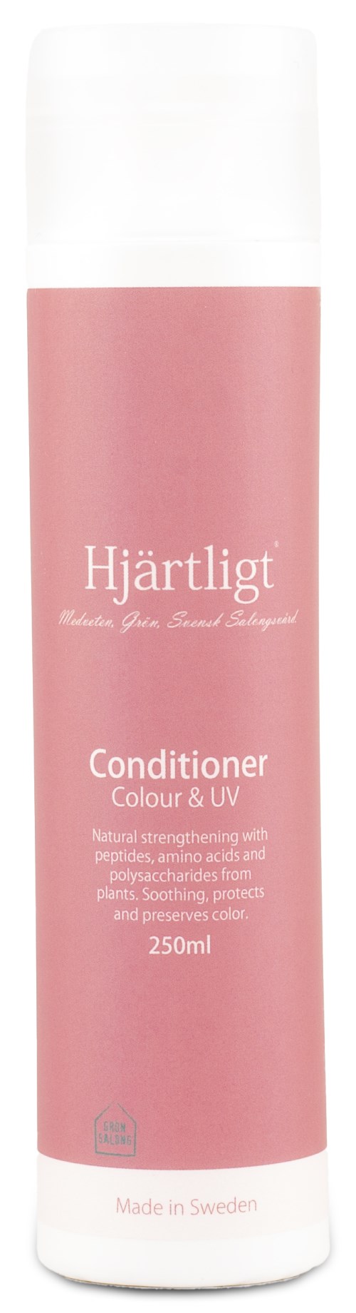 Hjärtligt Conditioner Colour & UV är ett ekologiskt färgbalsam med UV-skydd som förhindrar att håret tappar sin färg och blir matt. Det innehåller en speciell ekologisk blandning av keratin och risprotein som skyddar både naturligt och behandlat hår. När håret utsätts för solljus, oxiderar dess proteiner och lipider, vilket resulterar i förlust av styrka, glans och färg. Hjärtligts Färg & UV-serie motverkar denna oxidationsprocess genom att tillföra rikligt med antioxidanter från kallpressad rapsolja och solrosolja som är rika på E-vitamin. Dess formula med hög andel risprotein och biosackarider binder sig till hårets yttersta lager och stärker stråna, ger glans och förebygger att färgen bleknar för snabbt.