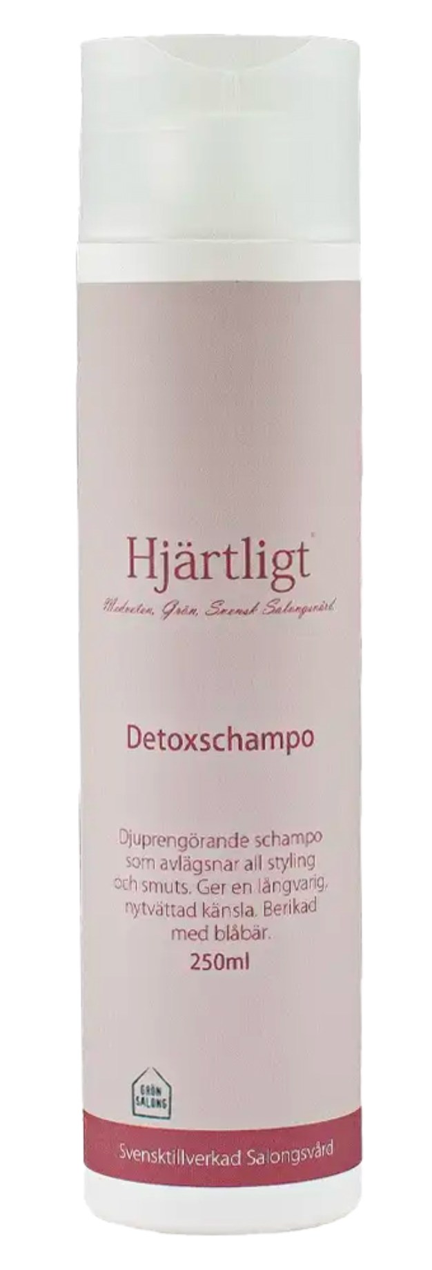 Hjärtligt Detox Schampo är ett djupverkande salongsschampo med långvarig effekt. Ett ekologiskt schampo med 100 % biologiskt nedbrytbara ingredienser - märkt med Grön Salong. Det innehåller bland annat pH-neutraliserande mjölksyra samt blåbärsextrakt, fritt från parabener, silikoner, PEG/PPG, nanopartiklar och hormonstörande ämnen. Producerat i Sverige.