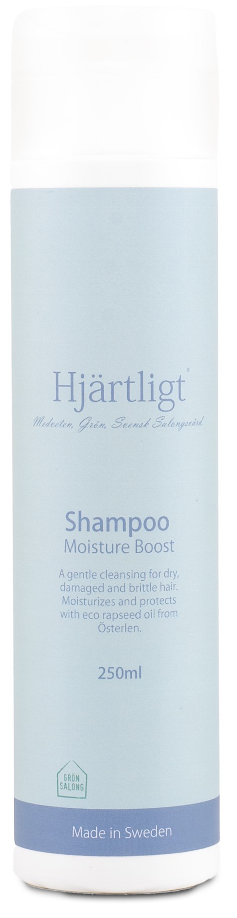 Hjärtligt Fuktboost Schampo är perfekt för dig som söker efter ett vårdande schampo som hjälper ditt hår att hålla sig återfuktat. Schampot är speciellt utformat för torrt och slitet hår som behöver fukt och lite extra omtanke. Med naturliga ingredienser såsom ekologisk rapsolja och björksocker vårdar det här schampot både torr hårbotten och torra längder. Samtidigt bevarar schampot fukten och skyddar hårets fibrer från att tappa fukt. Resultatet är ett väl återfuktat hår med skydd mot dagligt slitage.