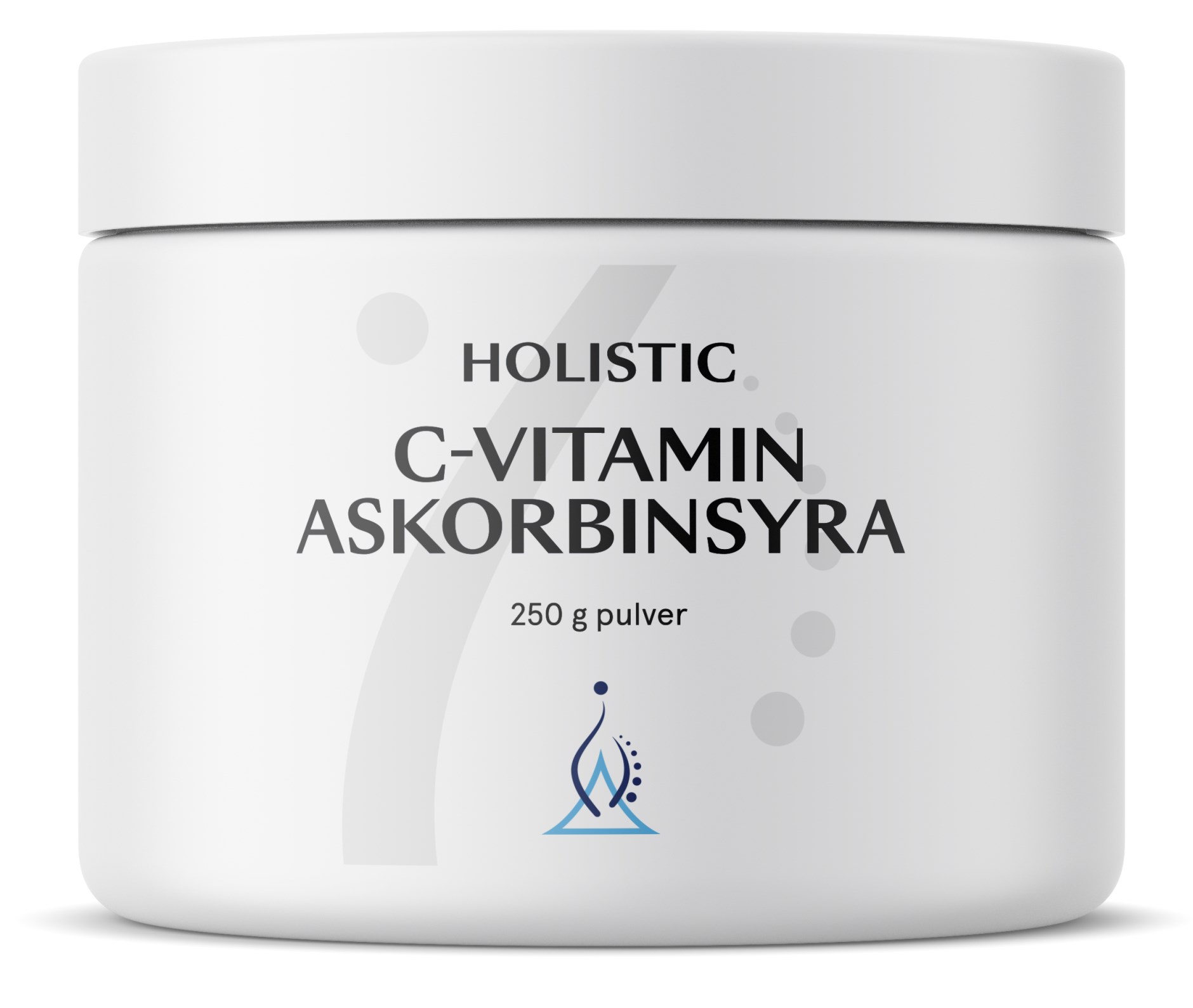Öka ditt intag av vitamin C med Holistic C-vitamin Askorbinsyra. Detta C-vitaminpulver består av 100 % ren askorbinsyra och du kan blanda det med vatten, juice eller varför inte i din smoothie? Pulvret har en syrlig smak och löser upp sig i vätska. C-vitamin behövs bland annat för immunsystemets normala funktion, för ett normalt upptag av järn och för nervsystemets normala funktion. Dessutom bidrar C-vitamin till kroppens egen kollagenbildning.