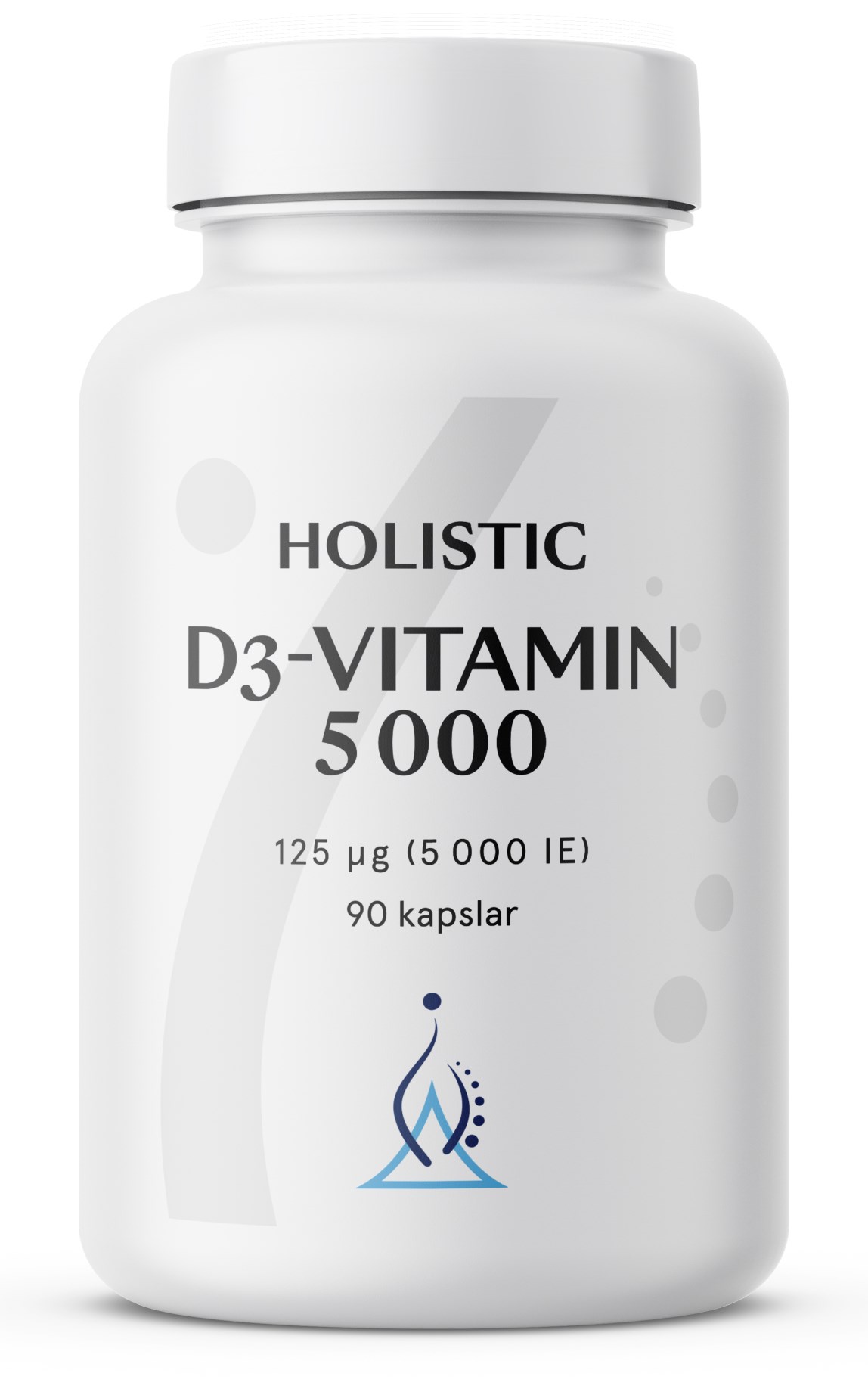 Holistic D3-vitamin 5000 innehåller D-vitamin i den aktiva D3-formen, samma som kroppen producerar vid solens exponering. Holistics kapslar innehåller 5000 IE (125 µg) vitamin D3 och är vegetabiliska samt kan enkelt öppnas för att blanda innehållet med mat eller dryck, om du inte vill svälja dem hela. På hösten och vintern, när solen står lågt, blir vi mer beroende av kost eller tillskott för vårt D-vitaminbehov. Hudens naturliga produktion av D-vitamin minskar dessutom avsevärt med solskydd och täckande kläder. Vitamin D3 stödjer bland annat normalt fungerande immunsystemet, muskler, tänder och benstomme samt kalcium- och fosforupptag och kalciumnivåer i blodet. Holistics burkar består av 96 % biobaserad plast.