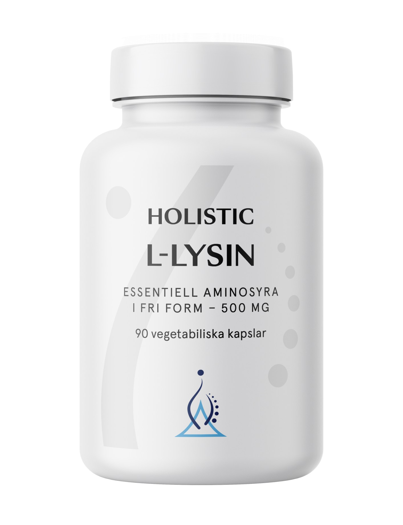 Holistic L-lysin är ett 100 % veganvänligt tillskott med den essentiella aminosyran lysin, med 500 mg lysin i fri form per kapsel. Att aminosyran är i fri form innebär att den inte är bunden till andra aminosyror eller är en del av ett protein, vilket underlättar upptaget i kroppen. Lysin behövs bland annat till bildandet av protein, vilket är viktigt för att bygga och reparera muskler och vävnader. I kroppen återfinns lysin i elastin och kollagen, viktiga komponenter i huden, blodkärl och ligament, som ger strukturell funktion, elasticitet och flexibilitet.