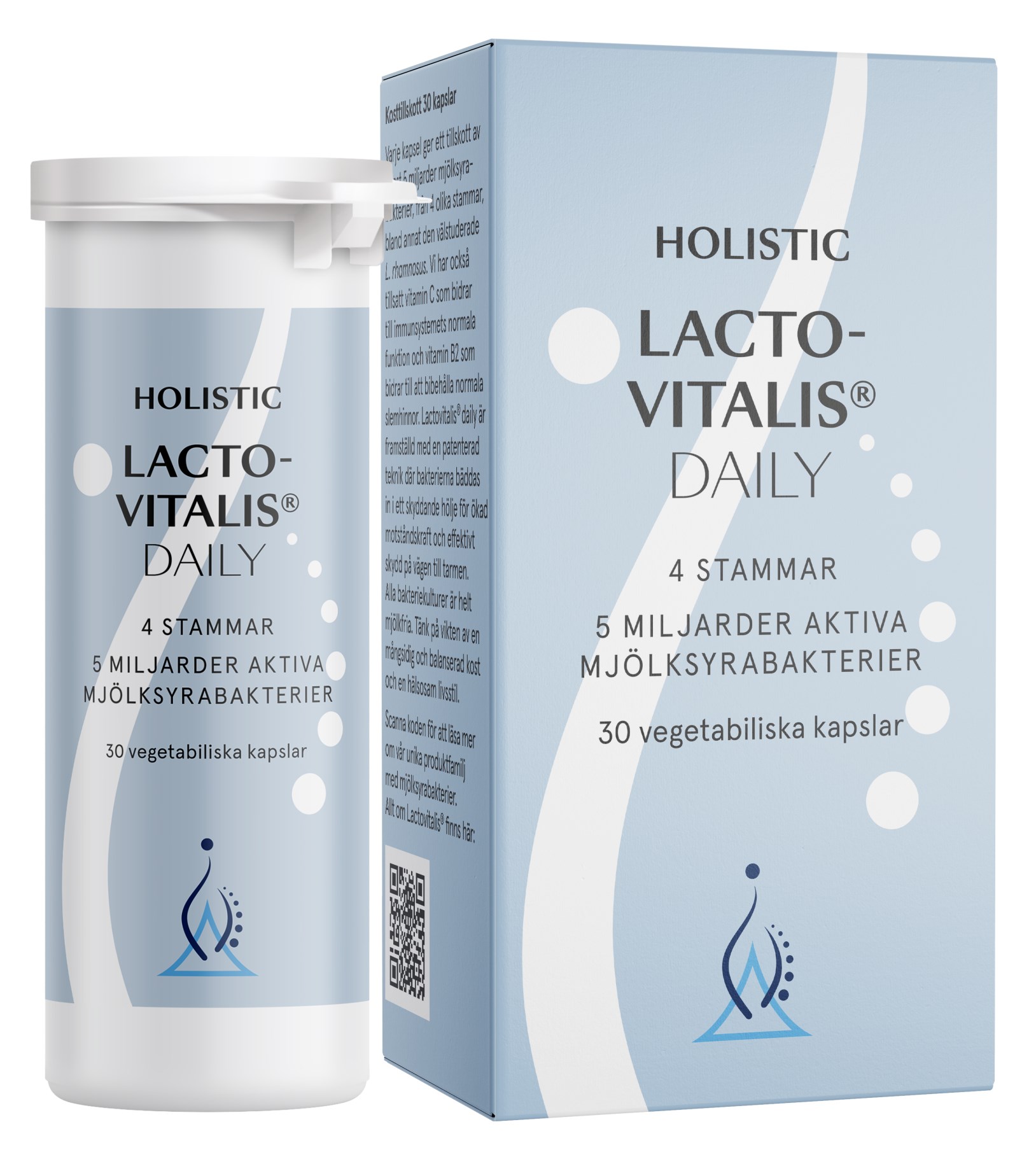 Lactovitalis Daily från Holistic är ett tillskott med mjölksyrabakterier från fyra olika välstuderade stammar, med minst fem miljarder bakterier per kapsel. Varje stam har sina unika egenskaper som kompletterar varandra för att främja en sund och balanserad tarmflora. Lactovitalis Daily innehåller också FOS (fruktooligosackarider) som är en typ av kostfiber som säkerställer en gynnsam miljö för tillväxt och aktivitet hos de gynnsamma bakterierna i tarmen. Dessutom är Lactovitalis Daily berikad med C-vitamin och vitamin B12 för att bidra till immunsystemets normala funktion och för att upprätthålla normala slemhinnor. Passar även dig som är vegan!