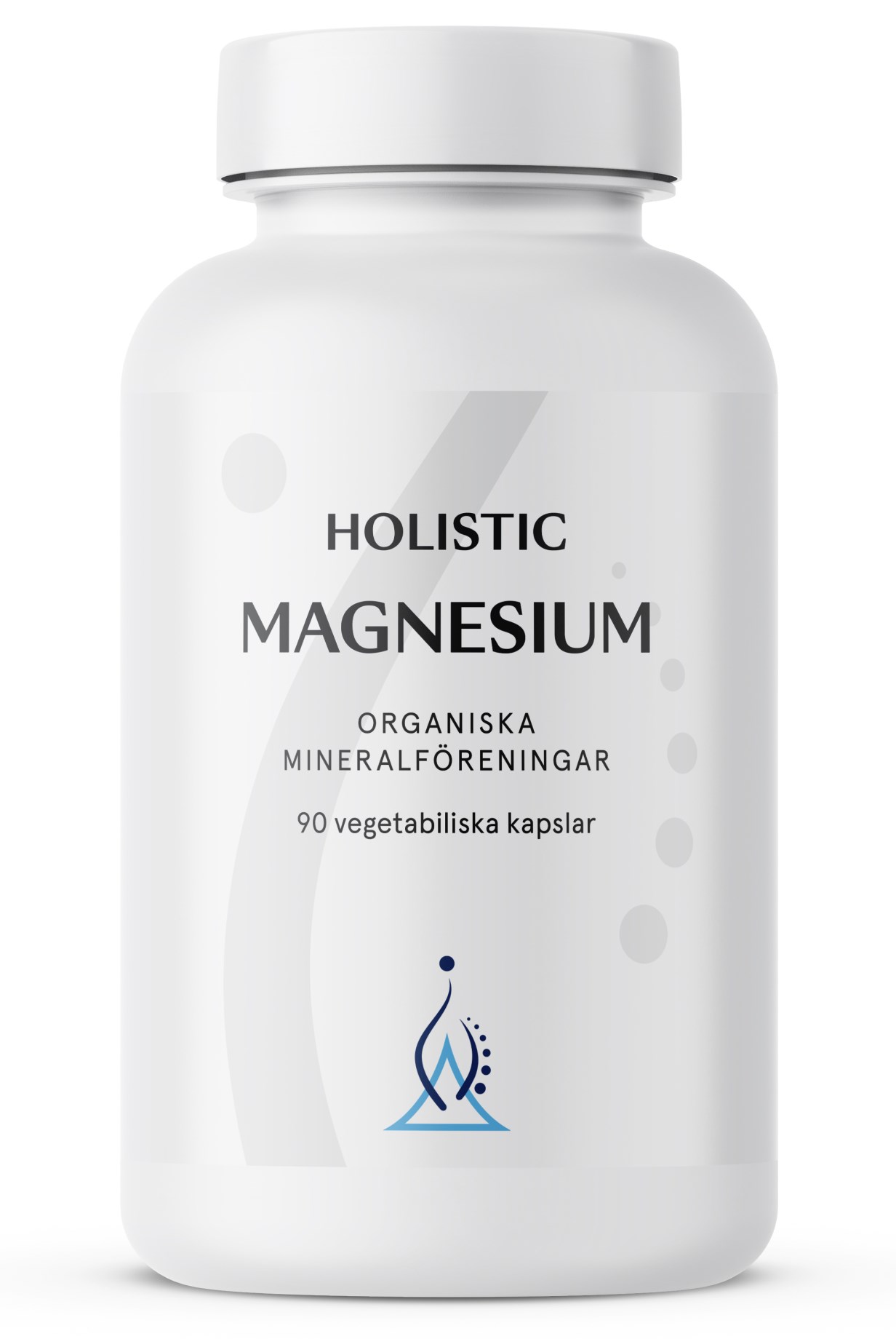 Holistic Magnesium komplex 120 mg kombinerar tre lättabsorberande former av magnesium: citrat, malat och laktat. Dessa varianter frigör fria magnesiumjoner i tarmen, vilket underlättar upptaget i blodet. Magnesium förbrukas snabbt under stress och är viktigt för fysisk och mental återhämtning. Förutom stress kan även koffein, alkohol och vissa läkemedel leda till förlust av mineraler, särskilt magnesium. Brist kan ge symtom som muskelkramper, trötthet och dålig sömnkvalitet. Magnesium hjälper till att avslappna muskler och nervsignaler, och bidrar till minskad trötthet, normal nervfunktion samt bibehållandet av benstomme, muskelfunktion och energiomsättning. Holistic Magnesium komplex är 100 % vegansk, och samtliga burkar består av 96 % biobaserad plast.