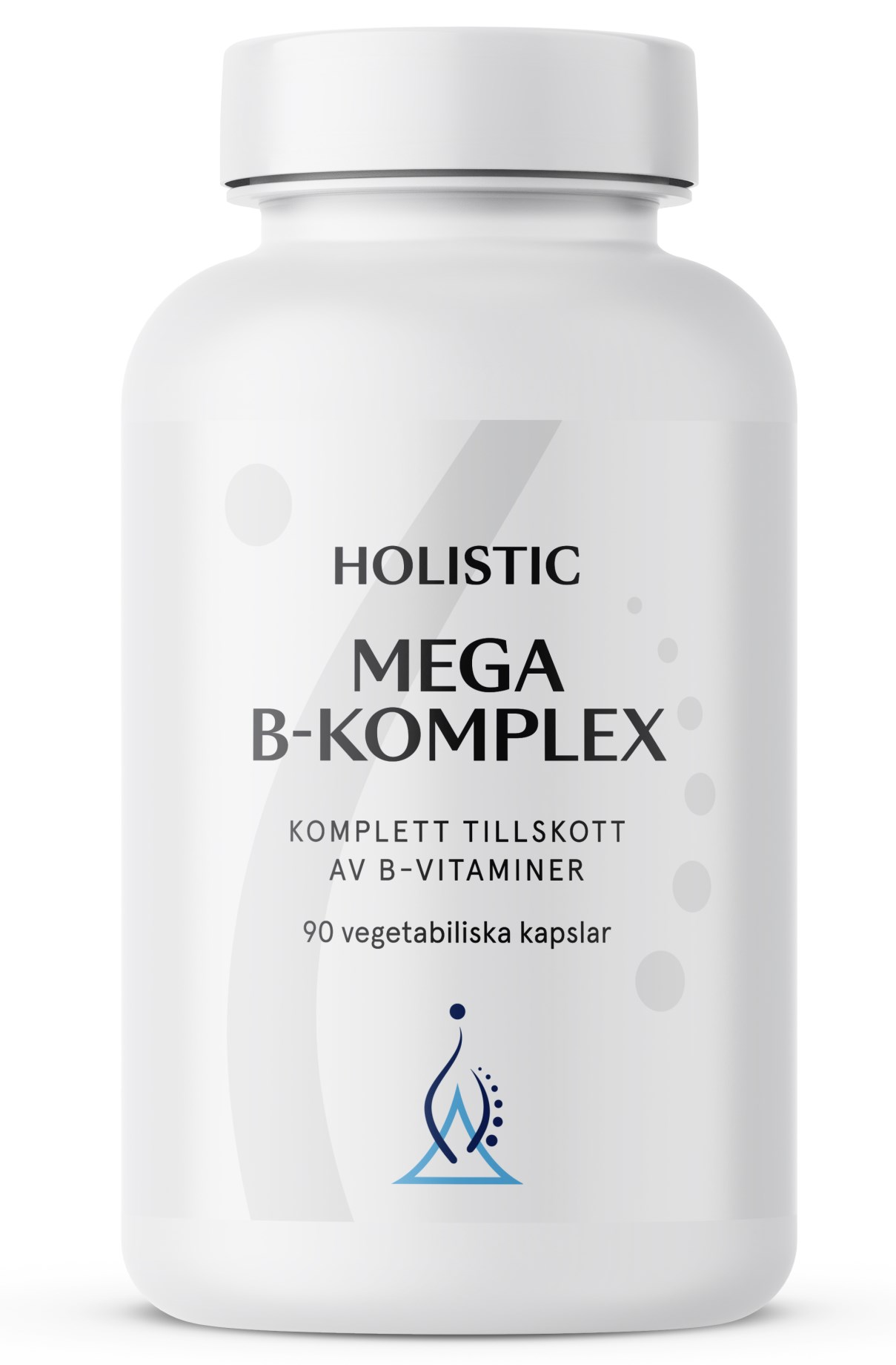 Holistic Mega B-komplex är ett tillskott som innehåller alla B-vitaminer från B1 till B12 samt inositol, kolin och PABA, utan jäst. Det ger en dagsdos av viktiga B-vitaminer i en och samma kapsel. B-vitaminerna stödjer energiomsättning, psykologisk funktion och nervsystemet. I perioder av stress och dålig kost kan behovet av dessa vitaminer öka. Tiamin bidrar även till hjärtfunktionen, medan riboflavin stödjer järnomsättningen och skyddar kroppens celler mot stress. Vitamin B6, B12 och folat bidrar dessutom till immunsystemets normala funktion och minskar trötthet. Holistic Mega B-komplex är 100 % vegansk och Holistics burkar är tillverkade av 96 % biobaserad plast.