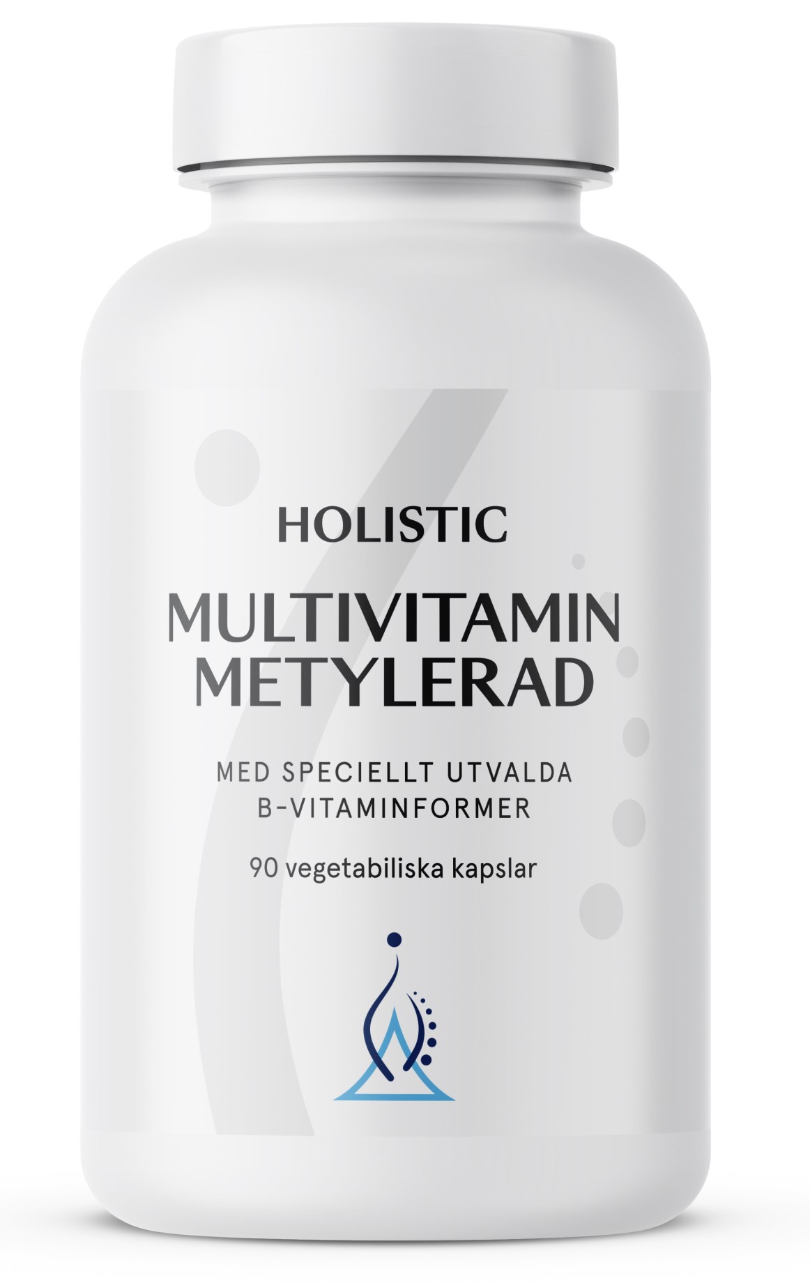 Holistic Multivitamin Metylerad är ett multivitamintillskott med ett högdoserat innehåll. I kapslarna finns även kolin, citrusbioflavonoider och speciellt utvalda källor till vitamin B12, vitamin B6, vitamin B2 samt folat. Alla dessa vitaminer är viktiga för kroppens metaboliska reaktioner och bidrar till reglering av ämnesomsättning. I Holistic Multivitamin Metylerad finns även vitamin A, vitamin C och vitamin D som bidrar till immunsystemets normala funktion. Vitamin A bidrar även till normal hud och vitamin C tillsammans med folsyra bidrar till att minska trötthet och utmattning. Kapseln är vegetabilisk och tillverkas av pullulan från majs. Med ett multivitamintillskott kan du säkerställa ditt dagliga intag av vitaminer.