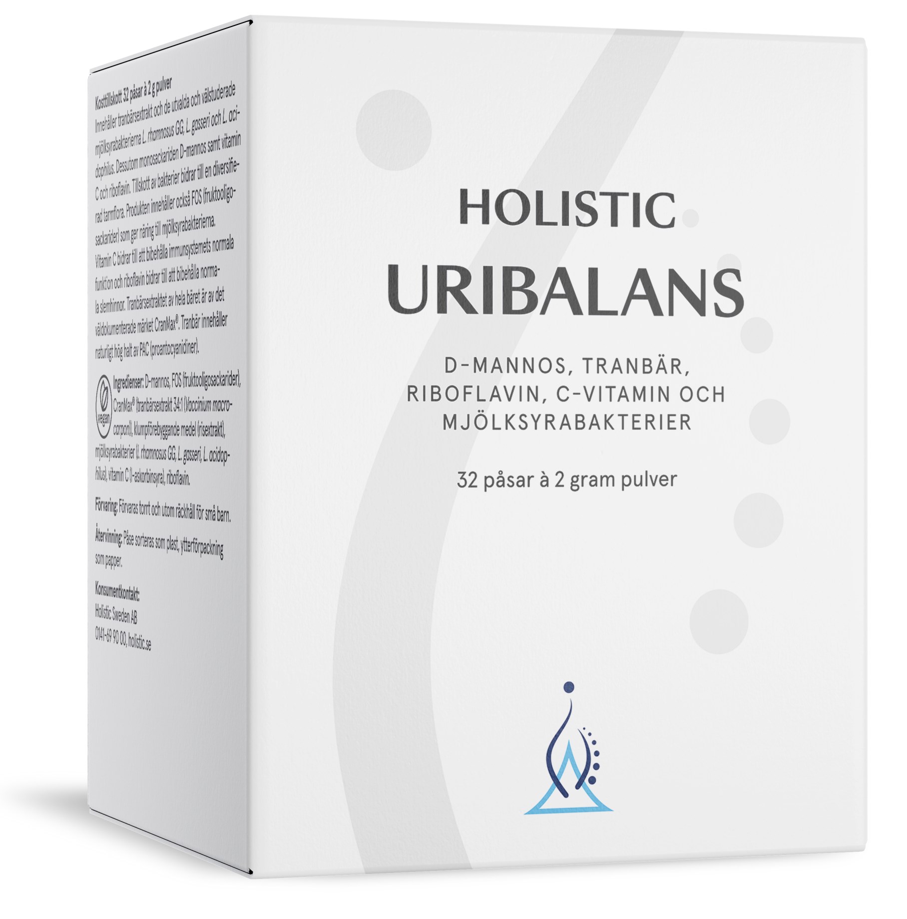 Holistic UriBalans är ett kosttillskott i pulverform som innehåller tranbärsextrakt, utvalda mjölksyrabakterier och monosackariden D-mannos. Tranbärsextraktet kommer från Cran-Max® som är ett väldokumenterat märke och innehåller rent och naturligt tranbärskoncentrat där hela tranbäret används, såväl skal som frön. Tranbär har sedan länge varit ett populärt alternativ för olika ändamål och sägs kunna ha en positiv inverkan vid lätta urinvägsbesvär. Holistic UriBalans har ett naturligt högt innehåll av proanto-cyanidiner (PAC) som kan bidra till att bakterier får svårare att sprida sig och fästa i urinvägarnas slemhinna. Pulvret är även berikat med 1 miljard mjölksyrabakterier för en normalfungerande mage och tarm.