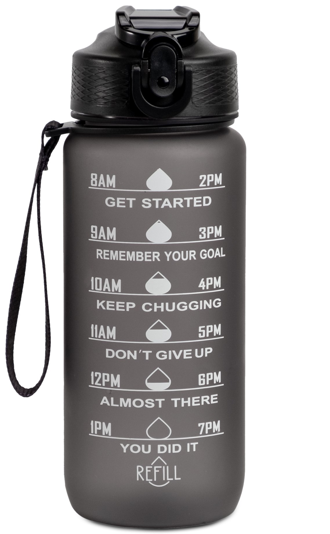 Med flaskan Hollywood Motivational Bottle blir det roligare att dricka vatten under hela dagen. Den snygga och funktionella flaskan rymmer 1 liter vätska och har smarta markörer som gör det enkelt för dig att hålla koll på ditt dagliga vätskeintag. Flaskan har uppfällbart sugrör och är läckagesäker. Den kan tvättas i diskmaskin i upp till 100 grader, men för att vara säker på att färgen håller rekommenderas handtvätt. En perfekt flaska för skolan, träningen, jobbet eller på resor som tål både varma och kalla drycker.