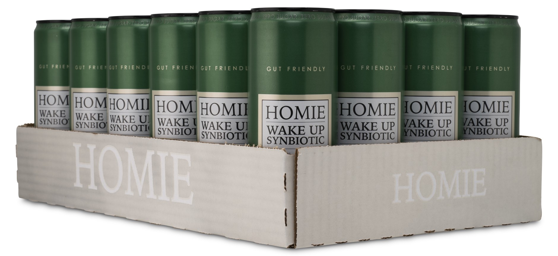 Få en hälsosam kick med energi med Homie Wake Up Synbiotic! Denna kolsyrade energidryck innehåller 100 mg naturligt koffein från grön kaffeböna som bidrar med ökad energi och förbättrad koncentration. Den är även berikad med levande bakteriekultur och utvalda vitaminer och mineraler som bidrar till en glad mage. Innehåller även reishi (lackticka) och cikoriarotfiber. Välsmakande dryck som finns i flera smakar och är perfekt att ta med sig till jobb, skola eller träning!