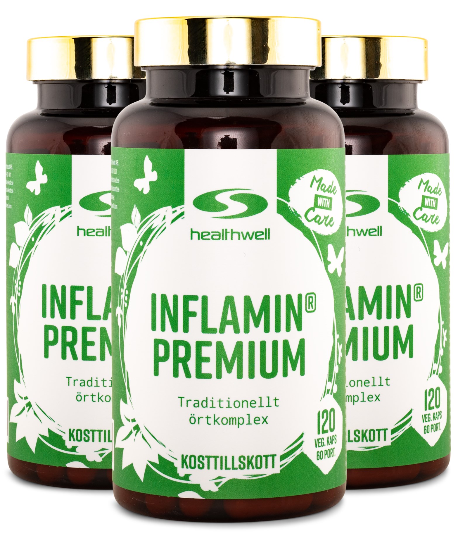 Healthwell Inflamin® Premium är ett extra högdoserat tillskott med en lång rad välkända standardiserade örter och växter. I detta komplex ingår bland annat ett fullspektrumextrakt av nypon, som ofta är en vanlig ingrediens i tillskott för leder, och som är naturligt rikt på vitamin C. Inflamin® Premium innehåller även en hög dos curcumin från den omåttligt populära örten gurkmeja, förstärkt med svartpepparextrakt för att optimera upptaget. Andra välkända örter är Boswellia serrata med sitt innehåll av boswellinsyra. Inflamin® Premium passar dig som vill ha ett liv i rörelse på ett enkelt sätt. Eftersom alla ingredienser är högdoserade slipper du komplettera ditt intag med flera separata tillskott - med Inflamin® Premium får du allt i en och samma kapsel!