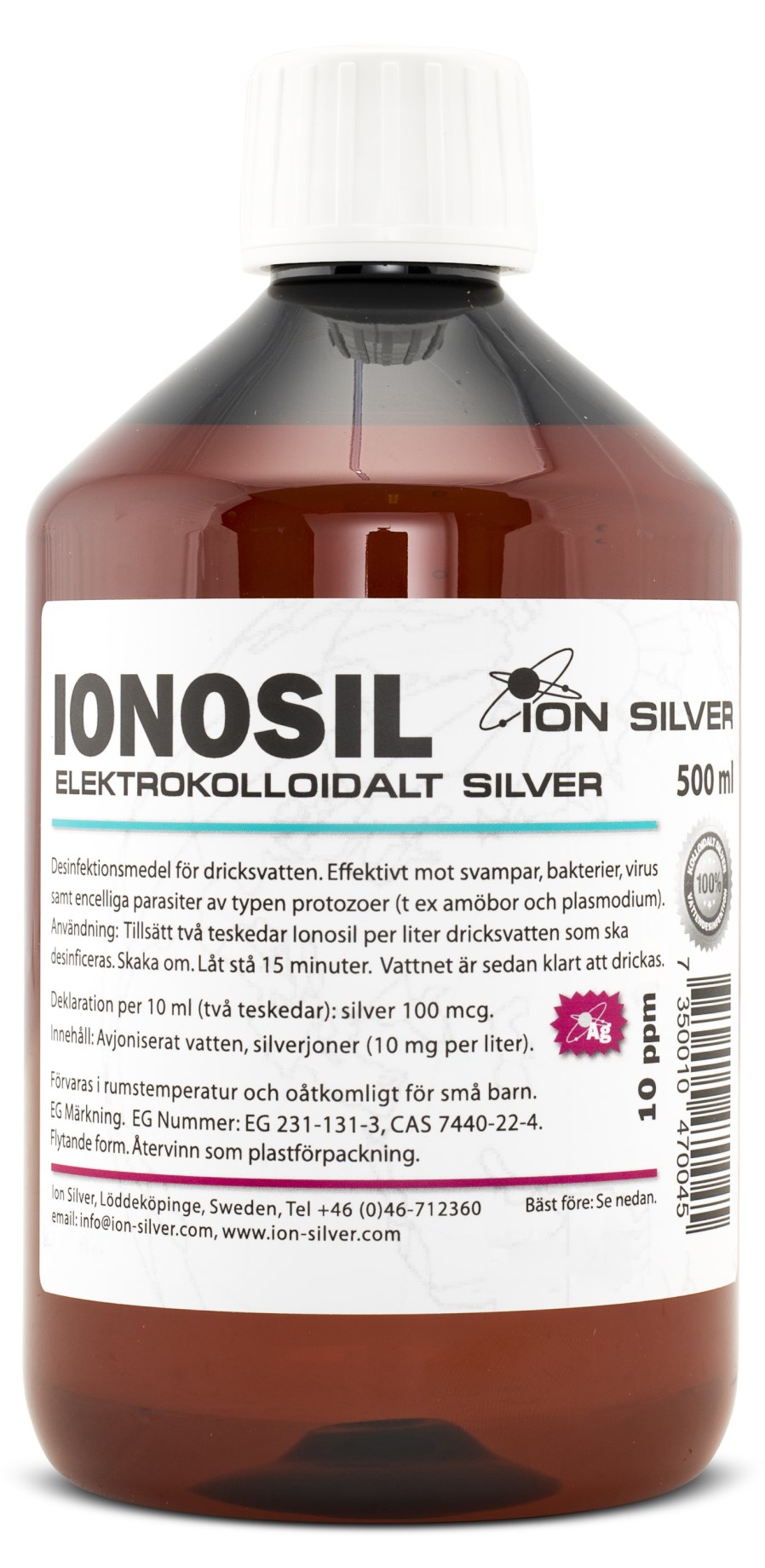 IONOSIL kolloidalt silver är en vattenreningsprodukt som består av avjoniserat vatten och silverjoner. IONOSIL är framställt med moderna elektrokolloidala produktionsmetoder. Hållbarheten ligger kring två år.