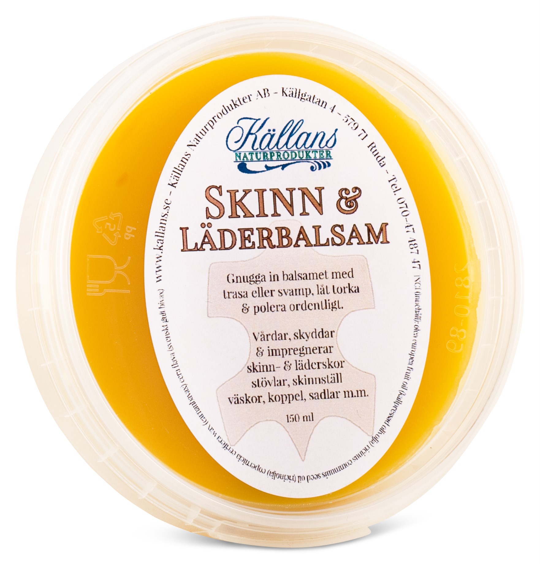 Källans Naturprodukter Skinn & Läderbalsam är ett naturligt balsam som mjukgör, impregnerar och skyddar skinn och läder. Utmärkt att använda till skinnsoffan, väskor, koppel, sadlar och skor m.m. Källans Skinn & Läderbalsam är tillverkat av vegetabiliska ingredienser samt svenskt bivax. 100 % naturligt, miljövänligt och närproducerat!