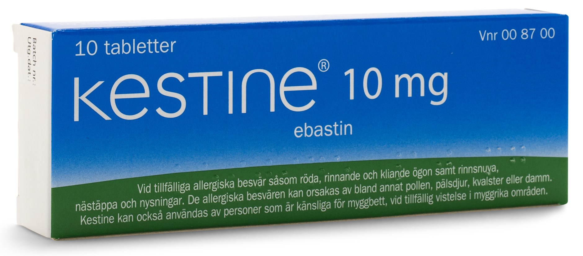 Kestine Ebastin är din räddare i nöden när allergierna slår till! Dessa tabletter intas när du upplever allergiska besvär såsom nysningar, nästäppa eller rinnande näsa samt kliande, röda och rinnande ögon. Kestine Ebastin är ett antihistamin som fungerar genom att motverka histamin, ett ämne som utsöndras när du utsätts för ämnen som du är allergisk mot. Kestine fungerar både vid allergi mot pollen från växter och mot allergiska besvär från damm, kvalster och pälsdjur. Tabletterna kan också användas av personer som är känsliga för myggbett eftersom antihistamin kan minska hudutslagen och klådan som uppstår av myggbetten.