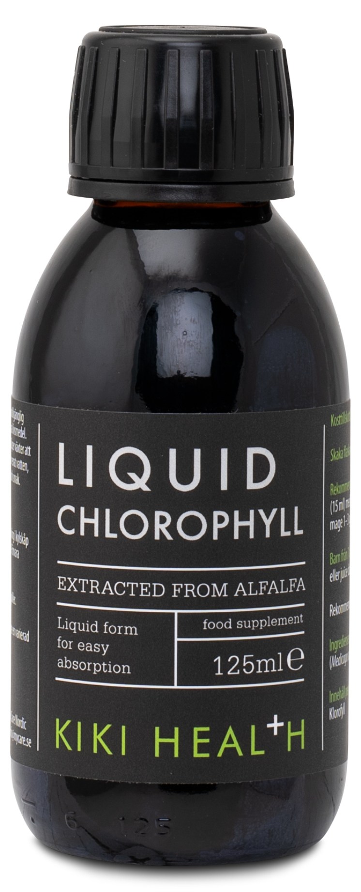 Kiki Health Liquid Chlorophyll är ett flytande tillskott av klorofyll utvunnet ur Alfalfa. Klorofyll är det ämne som färgar växter gröna, ett viktigt ämne som fungerar ungefär som växternas hemoglobin. Det är ett ämne som är rikt på antioxidanter. Kiki Health Liquid Chlorophyll är helt naturligt och växtbaserat med en naturlig smak.