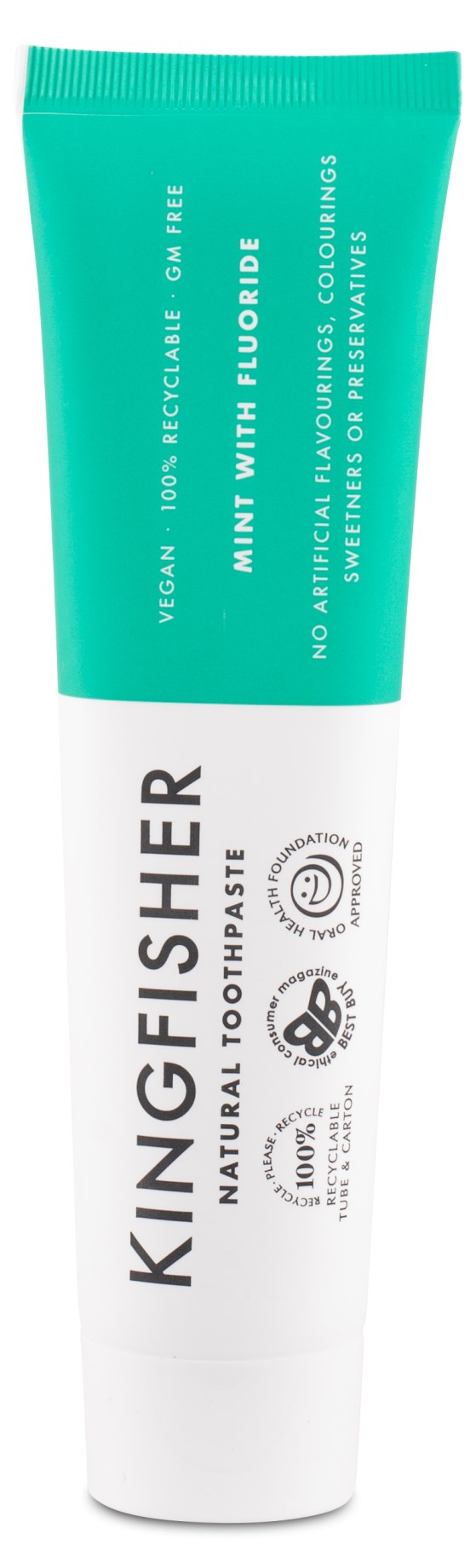 Tandkräm Mint Fluor från Kingfisher är en fluortandkräm som kommer bli nya favoriten på tandborsten. Den uppfriskande mintsmaken ger en ren och fräsch känsla i hela munnen. Dessutom är den fri från tillsatsämnen som exempelvis konserveringsmedel, färgämnen och aromämnen. En naturlig och vegansk tandkräm, perfekt för daglig användning för starkare och friskare tänder.