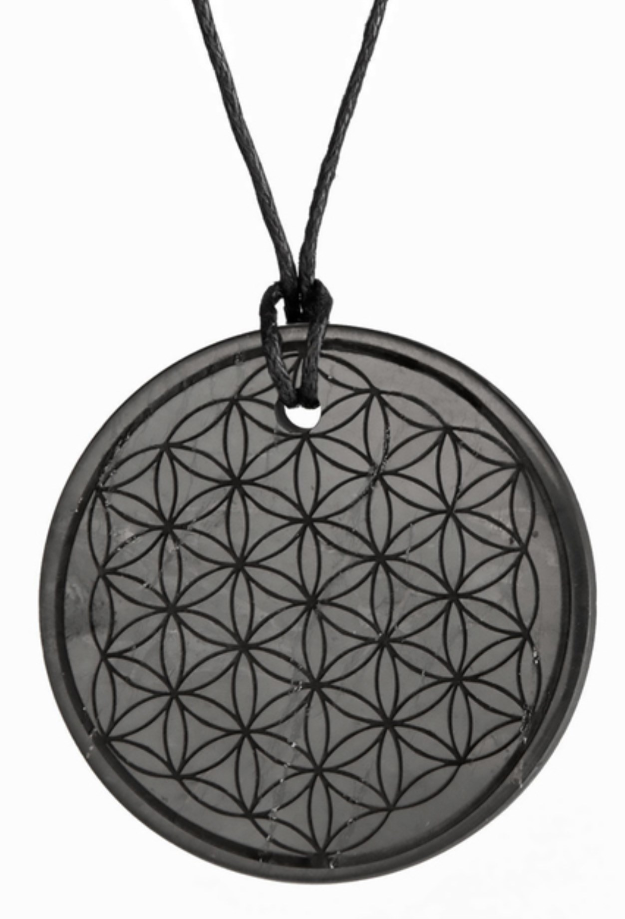 Shungitamuletten är 5 cm och rekommenderas att bäras med hudkontakt i höjd med hjärtat, exempelvis i perioder med mycket påverkan från elektromagnetisk strålning. Flower of Life, Livets blomma, är en symbol för universum, med 13 sfärer som utgör grundläggande geometri. Symbolen sammankopplas ofta med healing och kontakt med sitt inre.