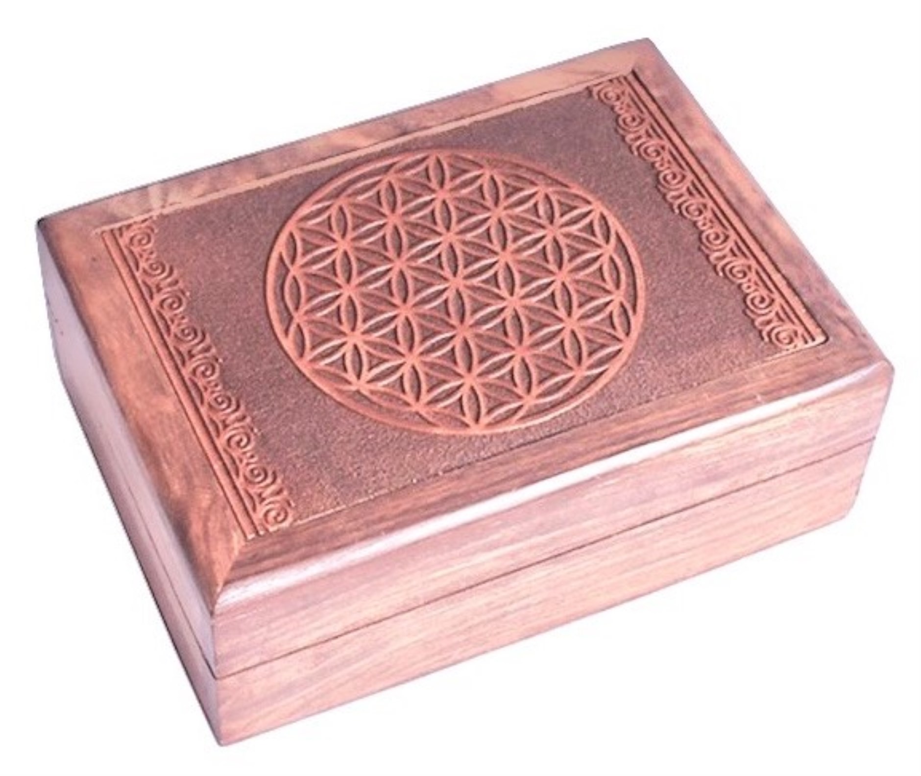 Kristallpunkten Skrin m Livets Blomma är ett vackert träskrin med gravering av livets blomma. Skrinet är handtillverkat i Indien av MDF-trä och har en röd tygklädd insida. Perfekt för förvaring av dina kristaller eller andra favoritsaker.