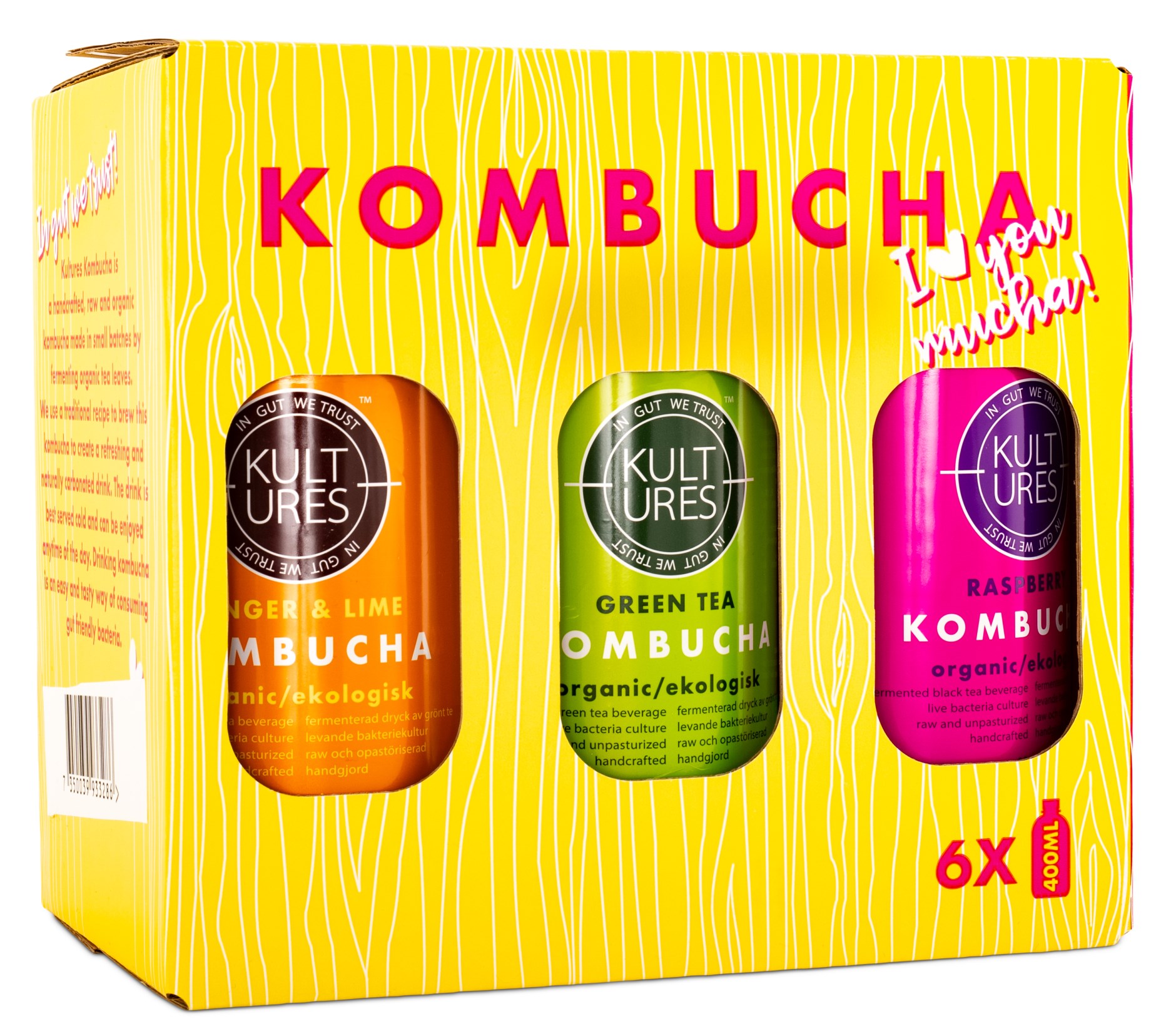 I Kultures Kombucha Mixlåda hittar du alla Kultures ekologiska kombuchadrycker samlade på ett ställe. Den fermenterade och lätt kolsyrade tedrycken har på senaste tiden blivit allt mer populär. Med sin levande bakteriekultur är den full av goda egenskaper - dessutom är den både fräsch och läskande! Kultures kombucha är ofiltrerad, raw och handgjord, vilket gör att alla nyttigheter från fermenteringsprocessen finns kvar. Perfekt till maten eller en varm sommardag!